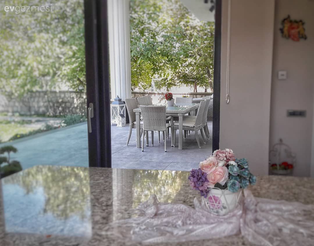 Ev müstakil; kocaman bir bahçesi, ağacın altında oturma alanları var. Ev sahiplerimiz kalabalık misafirler ağırlamaktan büyük keyif alıyorlar. Hem evlerini, hem de bahçelerini de bunu göz önünde bulundurarak tasarlamışlar.