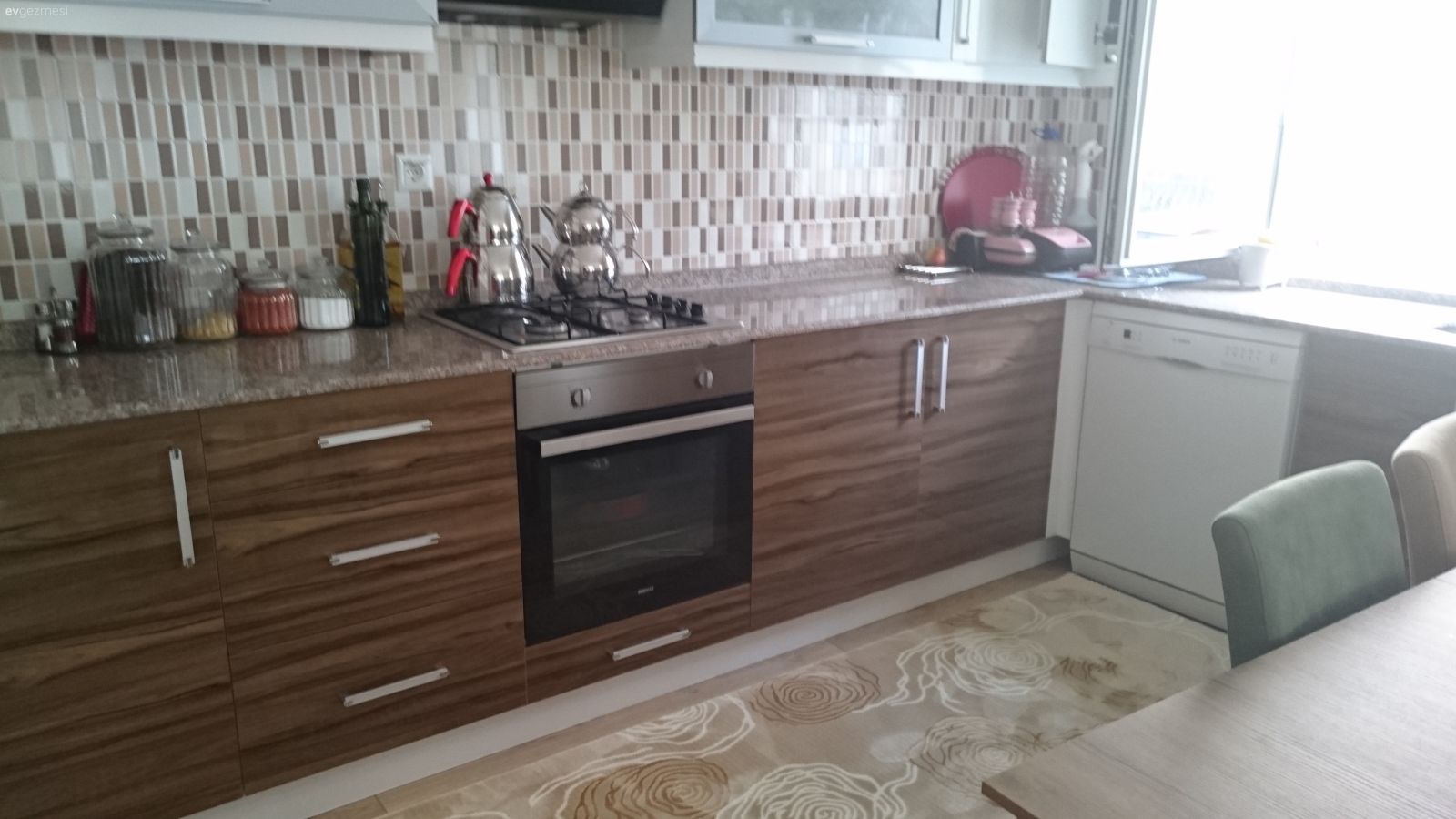 Mutfak ve banyoyu ev sahiplerimiz tasarlayıp, yaptırmışlar. Mutfak büyük değil, ama oldukça kullanışlı. Beyaz renk, alana ferahlık katıyor. Parlak, kulpsuz dolaplar ile yakalanan modern çizgi, sade renkte tezgah arası cam ve gri renkli tezgah seçimi ve geometrik desende halı ile devam ettirilmiş. Buyrun Demet hanıma tekrar konuk olalım..