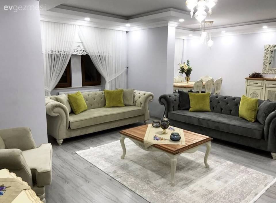Oturma Odası, Hardal, Sarı, Oturma odası avizesi, Avize, Modern avize, Fon perde, Perde, Yeşil, Krem, Halı, Modern