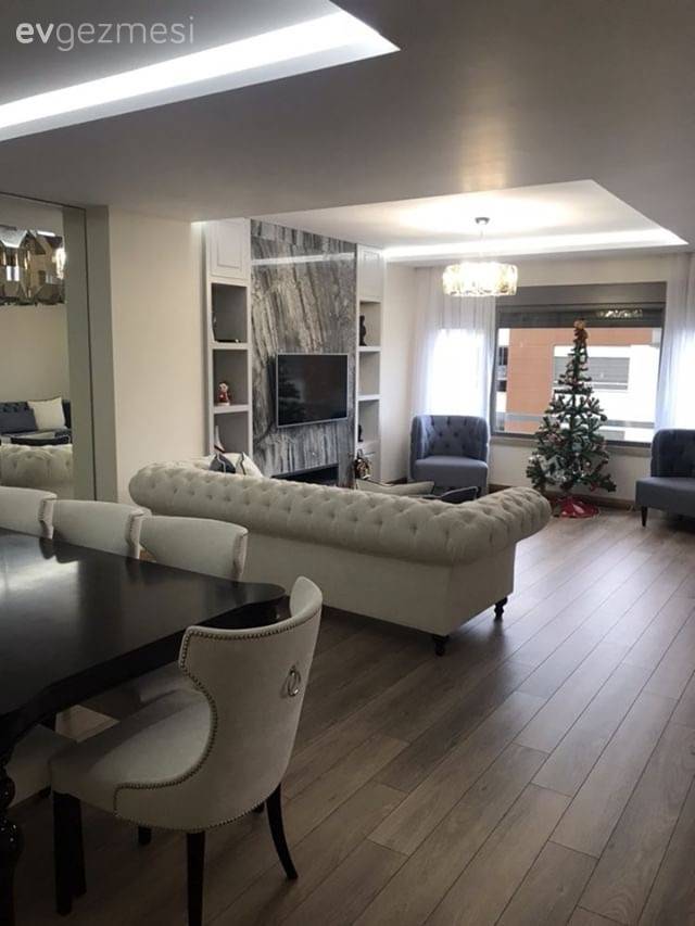 Salonda modüler bir köşe koltuk takımı tercih edilmiş. Köşe koltukların en büyük problemi yönleri sebebiyle yeni bir evde kullanıma uygun olmayabilmeleri. Ama böyle bir köşede değişim yapmak mümkün. İhtiyaca göre diler iki çiftli gibi, diler uzanma koltuklu bir büyük kanepe gibi kullanılabilir. Ev sahiplerimiz için kullanışlılık önemli. Bu sebeple de ara ara o zamanki kullanımlarına göre değişimler yapabiliyorlar.