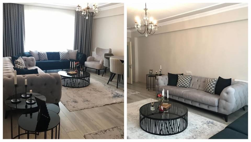 Salon, Gri, Orta sehpa, Bronz ayna, Beyaz halı, Berjer, Tül perde, Sade tül, Fon perde