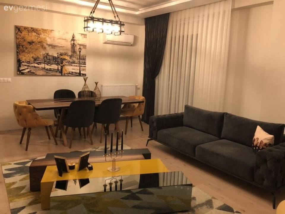 Ev sahibimiz Merve hanımın salonu, bu stilin yeni yorumunun hoş bir örneği. Ana renk olarak mavinin koyu ve güçlü bir tonu parlament mavisi seçilmiş. Detaylarda ise katıldığı her alana cazibe ekleyen altın var. Bu iki güçlü rengi dengelemek için serin nötrlerden gri kullanılmış. Çok da uyumlu olmuş.