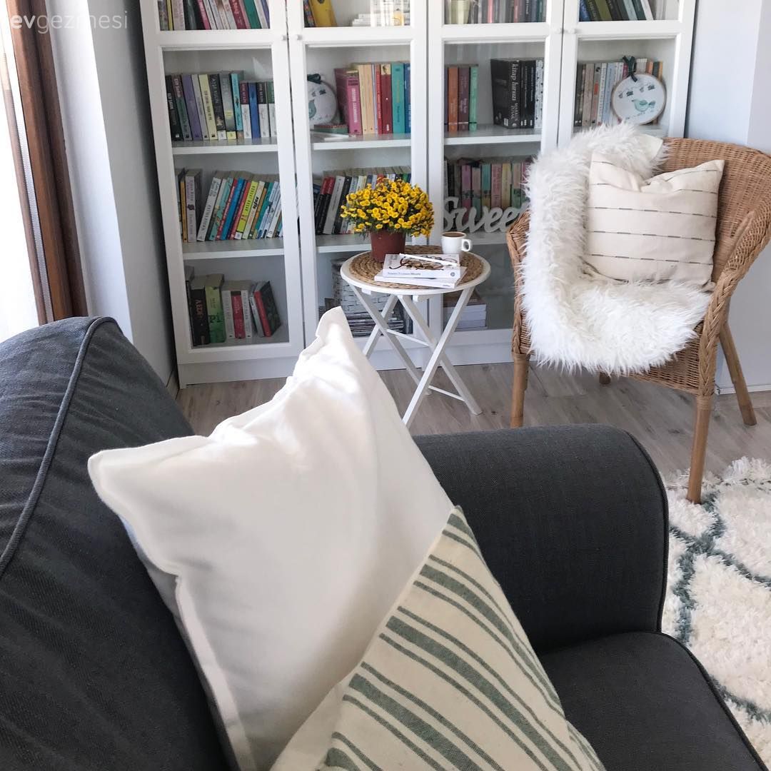 Dekor doku yönünden çok zengin. Jüt kumaşlar, hasırlar, cam ve pirinç, ahşap, kadife ve post dokusu farklı yerlerde yer almış. Ev sahibimizin dekoruna ilgi çekiciliği sadece renk ve aksesuarlarla değil, dokularla da katmış.