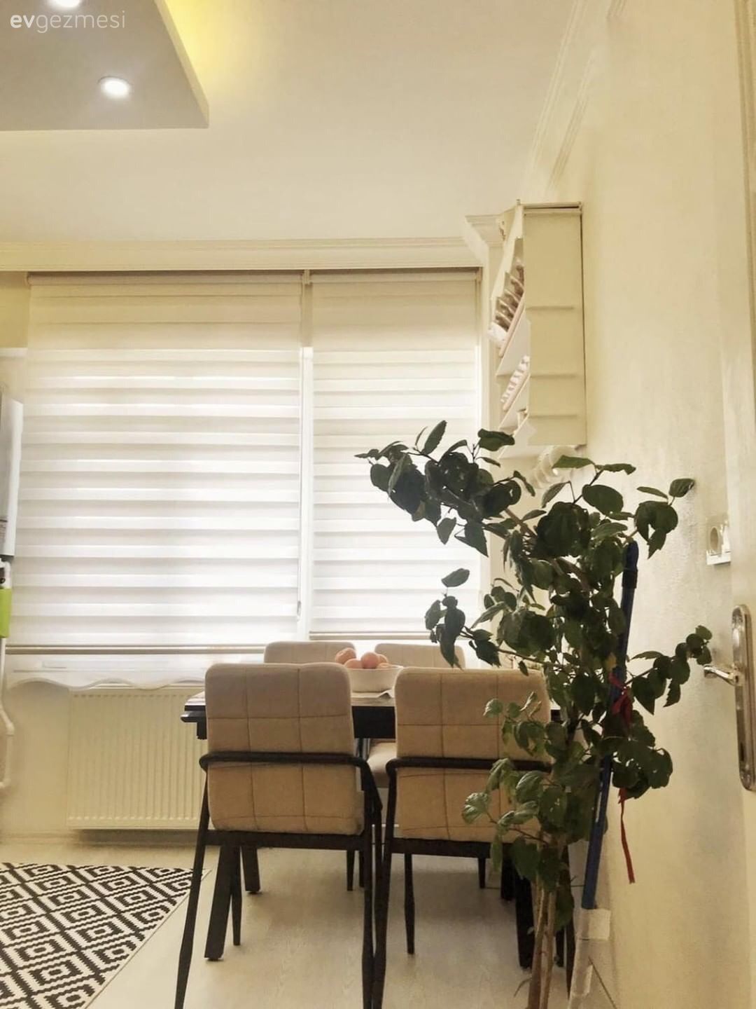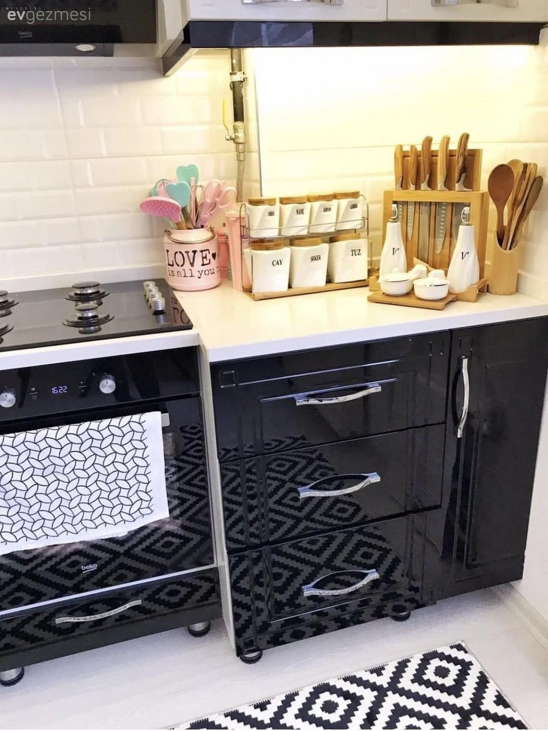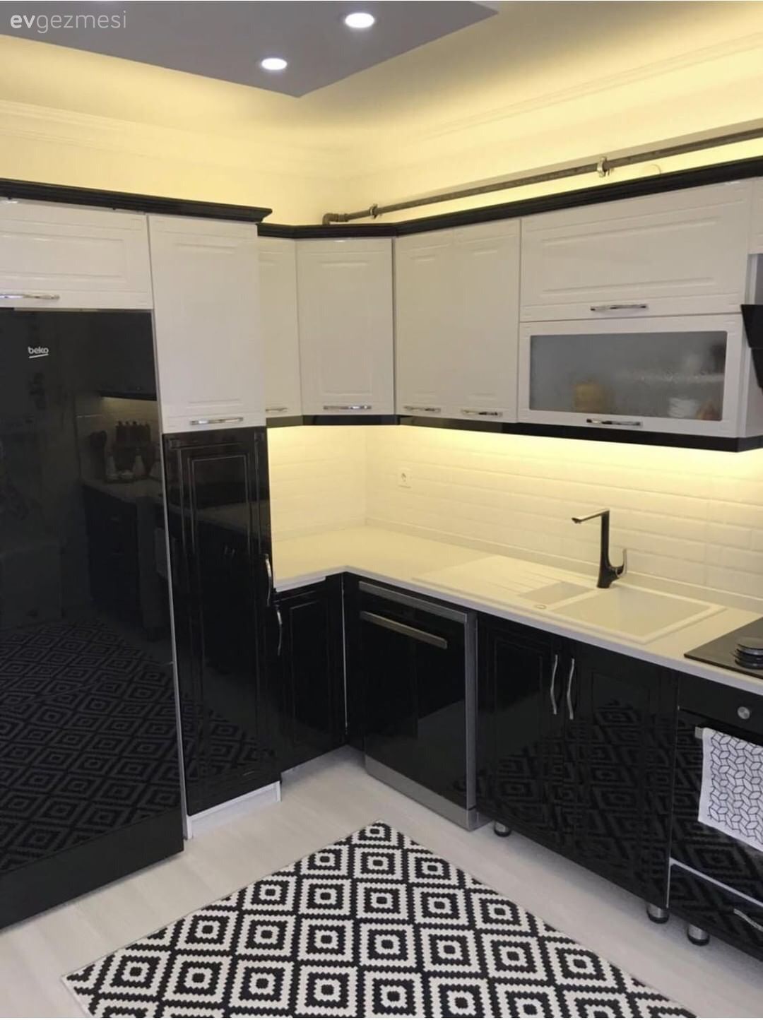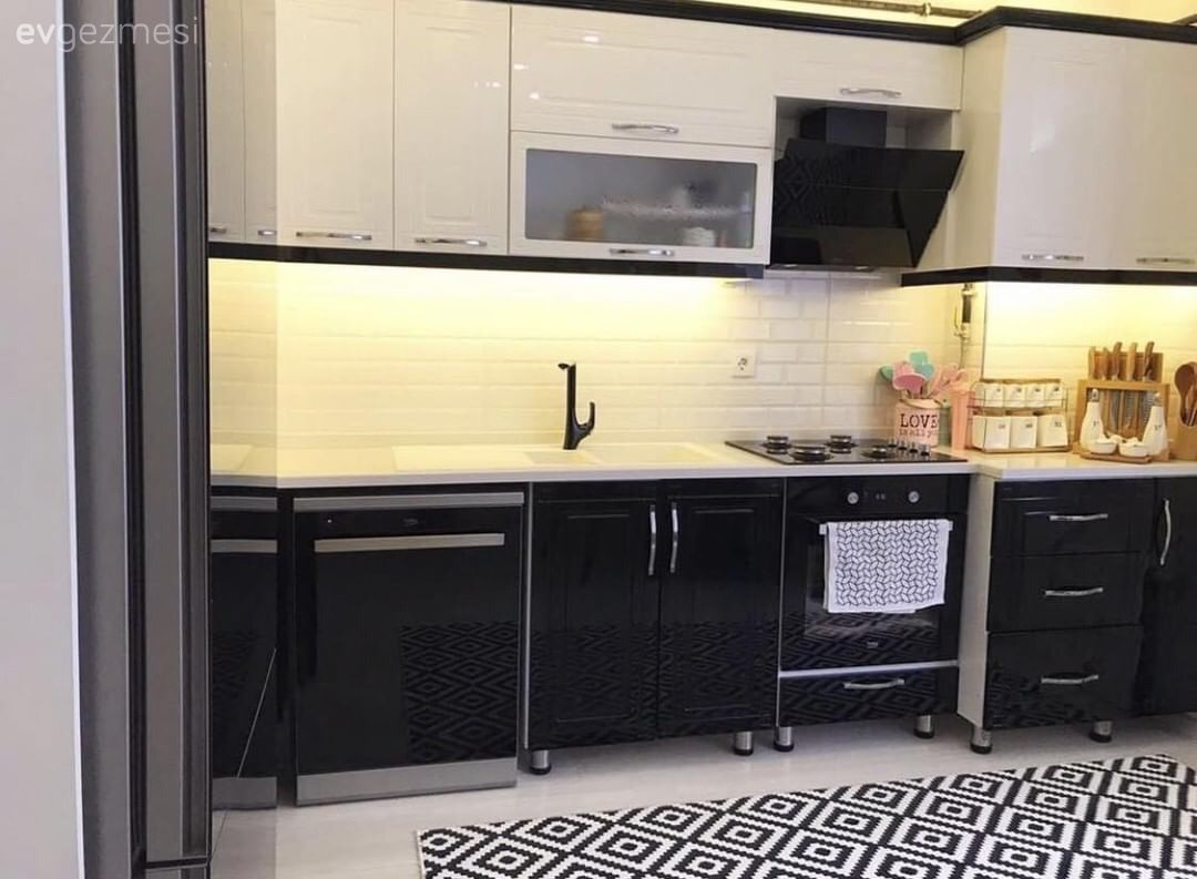 Mutfak, ev sahibimizin eşinin daha önce yaptırdığı bir mutfak. Değişim yapmadan siyah-beyaz renklerine uyumlu beyaz eşya ve halı ile tamamlamış bunları ev sahibimiz.