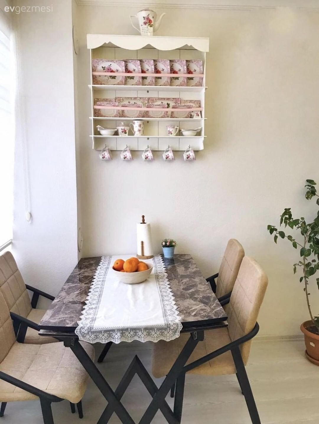 Oturma odasında zarif formlu gri köşe koltuk, siyah kareli kırlentler, hardal fon perdelerle nasıl uyum sağlıyor. Tabi uyumlu halı ve gri duvarı da unutmamak lazım. Hasret hanımın evi fazla eşya ile boğulmamış. Alana uygun seçimler, modern stil ile uyumlu renk paletleri ile tamamlanmış.