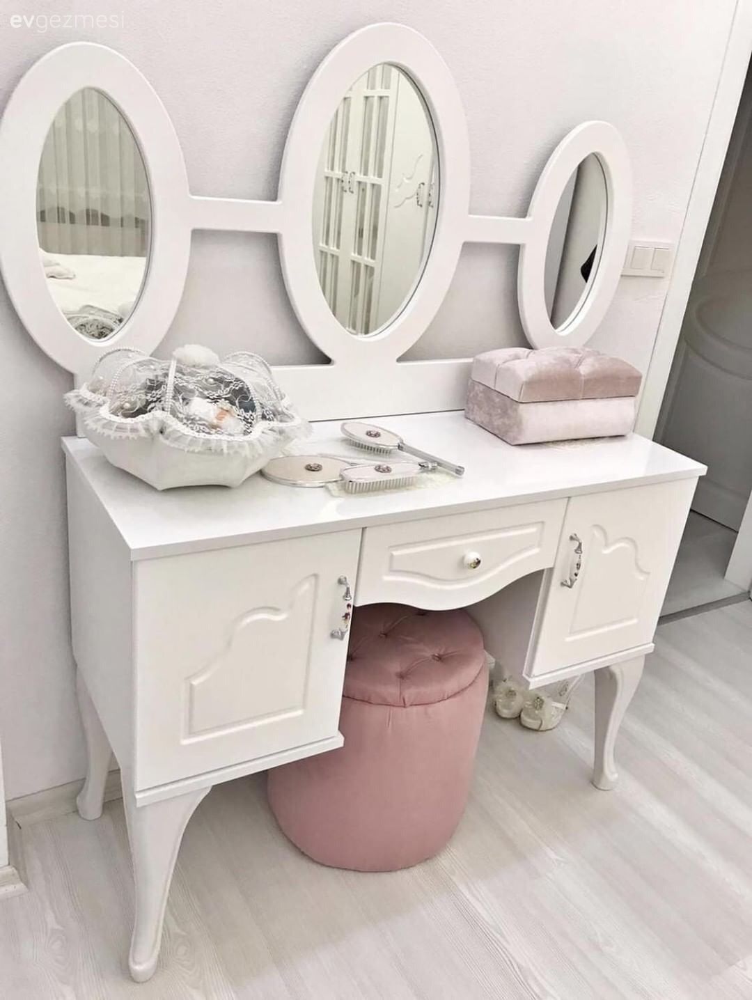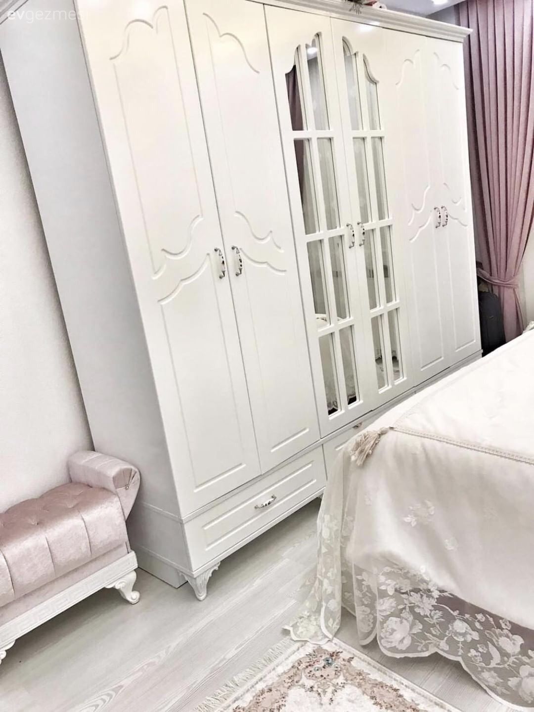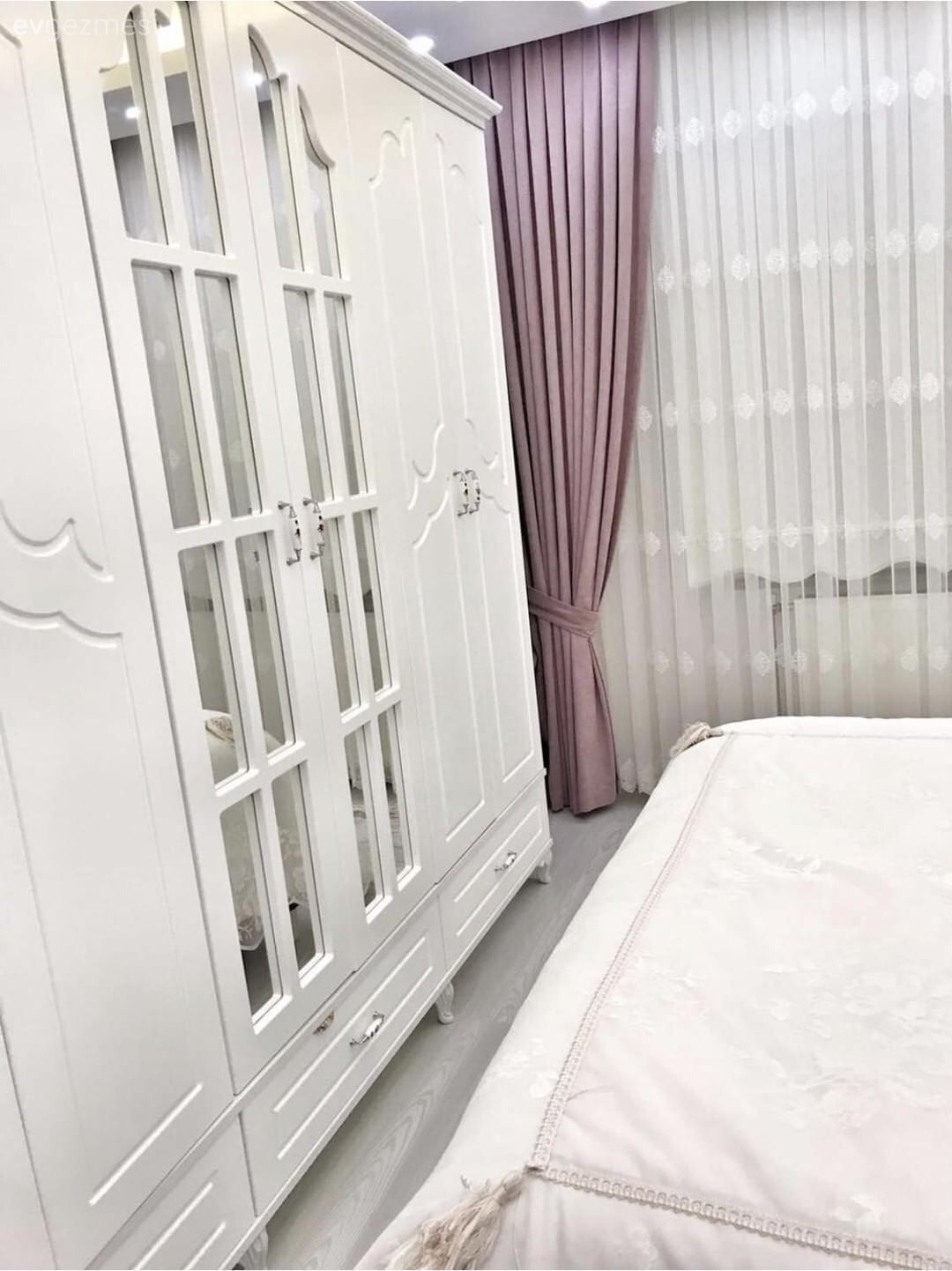 Yatak odası ise evin diğer bölümlerinde gördüğümüz modern çizginin aksine daha klasik bir tasarıma sahip. Yatak tacı üzerinden sarkan cibinlik, klasik yatak örtüsü ile birlikte çok şık bir ortam oluşturuyor. Beyazlar pembe ile sıcaklık kazanmış.