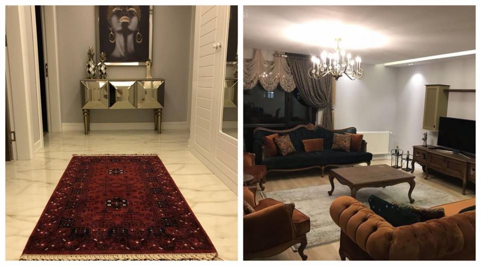 Dekorun biraz modern, biraz geleneksel bir yüzü var. Modern chesterfield koltuk takımı tam da buna uygun bir seçim. Mutfak dolapları da bu hissi devam ettirmiş. Shaker kapaklar, camlı vitrin gibi klasik seçimlerle bir arada. Tavanda aynalı panel ve asma tavan içinde spot aydınlatmalar, açık konsept alanın bölge bölge birbirinden ayrılmasını sağlamada çok etkili. Planlanması ise şahane olmuş!