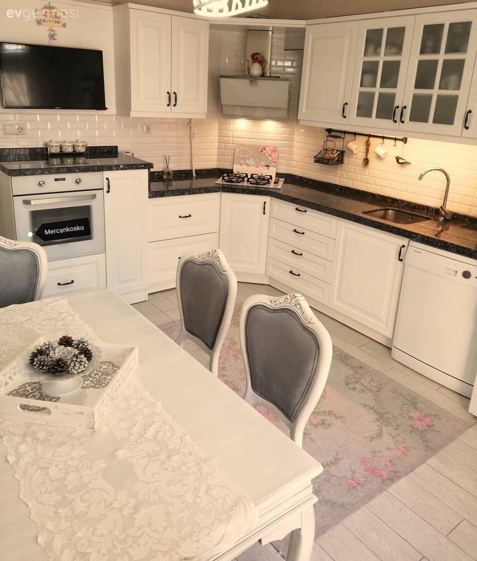 Her odada biraz country esinti var. Mesela sade çizgisi olan mutfak dolapları, porselen kulplar, desenli rustik perdelerle bu stili kazanmışlar. Yatak odası ise, zarif hatlı mobilyalar, cibinlik gibi tatlı dokunuşlarla hem neşeli, hem nostaljik bir hisse sahip.