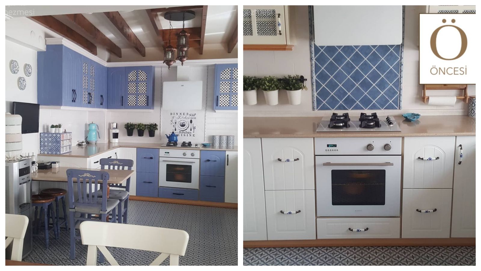 Çelik mavi Gülden hanımın çok sevdiği bir renk. Zemin seramiklerine de uyumlu. Önceden beyaz olan kapakların bir bölümünü ve sandalyeleri çelik maviye boyamış. Seramikler için de bir çılgınlık var. Stencil ile desen katmış ev sahibimiz.