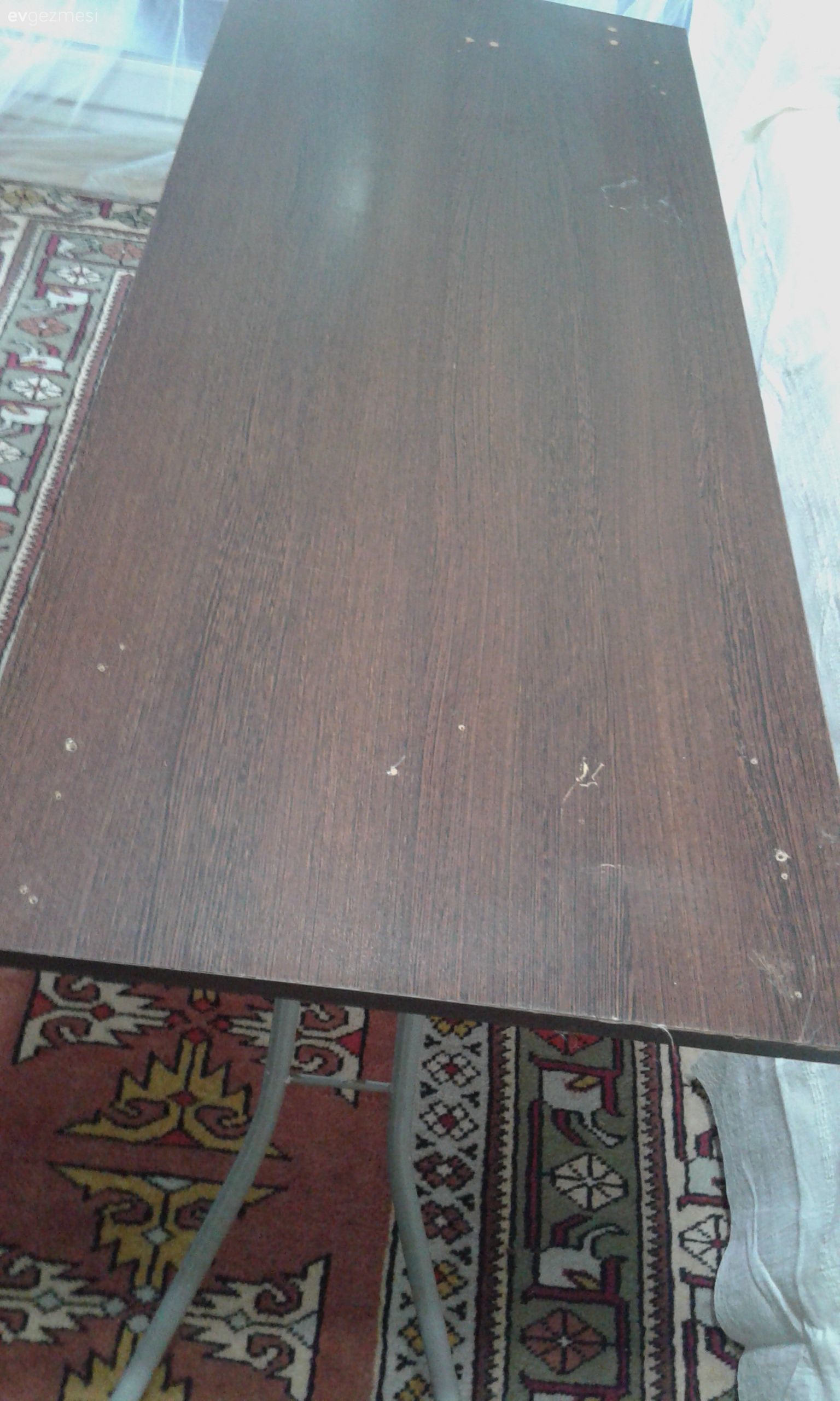 Bir gün beklemeden sonra, beyaz eskitme boyası ve kuru fırça ile hafif eskitme yapılmış. Bir gün daha da beklenip bir kat taş vernik atılmış. Taş vernik çok parlak sonuç verince, daha sağlam olması için bir gün daha beklenip, birer gün ara ile kadife vernik ile matlaştırılmış.