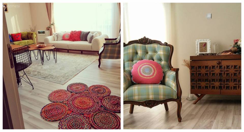 Dekorun doğal hissi, doğal dokularla da pekişmiş. Hasır avizeler, çiçeklikler, vazolar, duvar dekorasyonları, jüt halılar, tabi ki ahşap ve daha pek çok doğal doku var.
