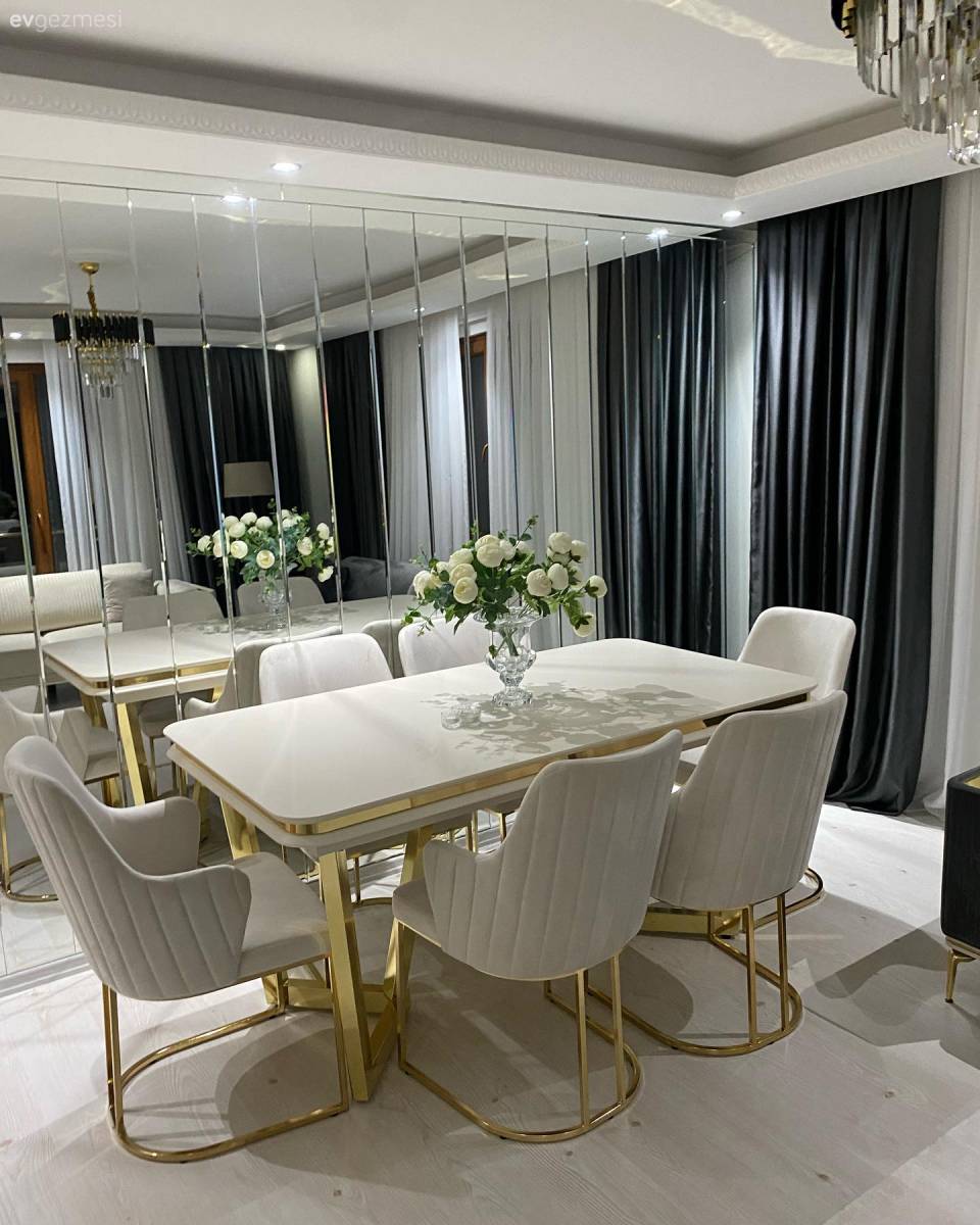 Modern stile lüks dokunuşların hüküm sürdüğü evde, güçlü renkler, keskin çizgiler var. Baklava ayna, çıtalarla duvar dekorasyonu gibi dekora göz alıcı bir his katan detaylar eklenmiş. Duvardan duvara aynanın duvara montesi ev sahiplerimizin kendi emekleri. Çok da profesyonel bir çalışma olmuş. Bu ayna içeri giren ışığı yansıtıyor, salonu ışıl ışıl yapıyor.