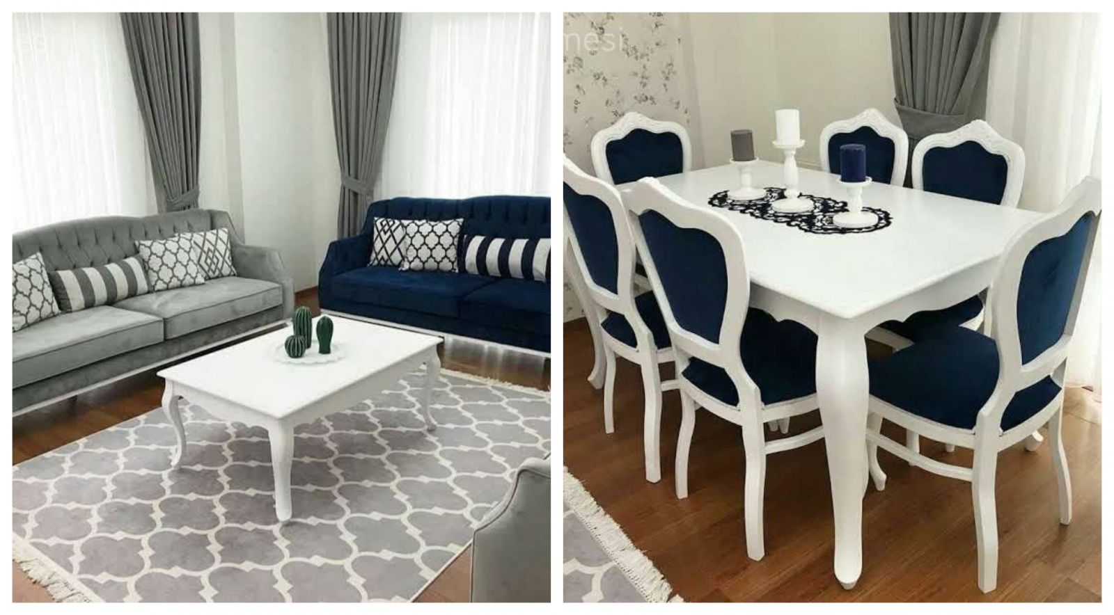 Renkleriyle klasik stile, mobilya tarzıyla da countrye göz kırpan bir salonla tanıştıralım sizi. Salonda lacivert gibi baskın bir renk tonu var. Ama, iç karartıcı bir halde değil. Çünkü yanına gri ve beyazın sakin ve serin havasını almış.