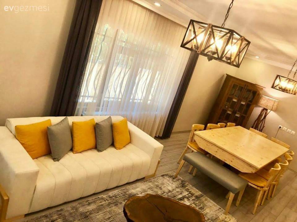 Salonun modern yüzünü destekleyen çok parça var. Konforlu bir şekilde köşede sakince duran L koltuk, alışılmışın dışın çıkan spotlar ve ikonik görünümleriyle salona doğallık katan kütük sehpalar gibi.
