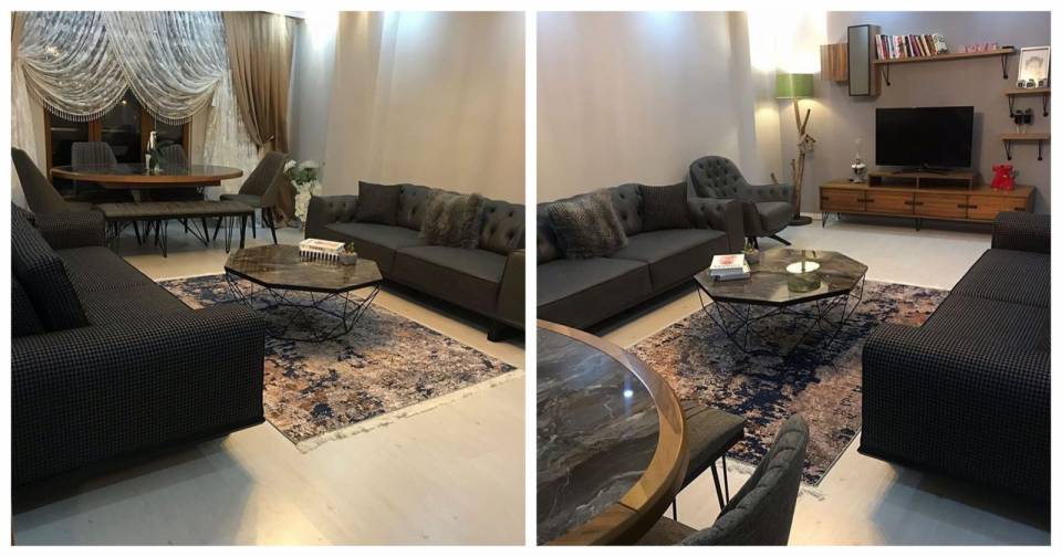 Bu evde duvar dekoru kadar sevilen bir diğer detay da loş aydınlatmalar. Salonu tamamlayan hasır görünümlü avize, çok aydınlık istenildiğinde kullanılıyor. Ama söz konuşu loş, romantik ambiyans olduğunda, bu avizenin yerini led aydınlatmalarla, mumlar alıyor.