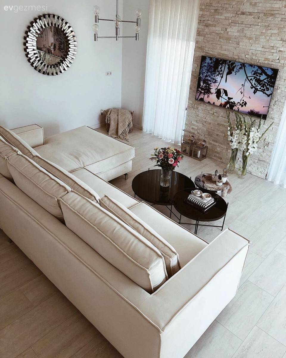 Küçük alanların daha ferah gösterilmesinin ilk yolu beyazdan geçer. Bu kuralı çok iyi bilen Hatice Hanım, yaşam alanının duvarlarında ve koltuk takımında beyazı kullanarak ferahlığı sağlamış. Ortama biraz daha farklı bir ambiyans katmak için de duvarlardan biri, açık gri tonlarıyla renklenmiş.