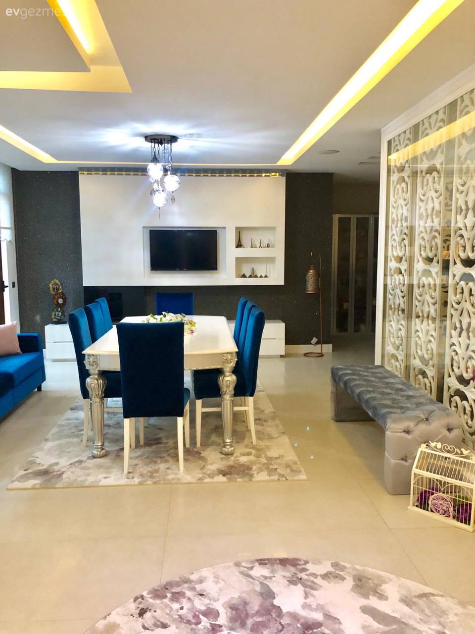 Mutfağın klasik detaylarını oluşturan parçalar da, geniş alanın öteki yüzünde. Mutfağın oturma alanı olan bölüme eşlik eden şık tasarıma sahip tv ünitesi hem klasik hem de sıra dışı bir görünümde.