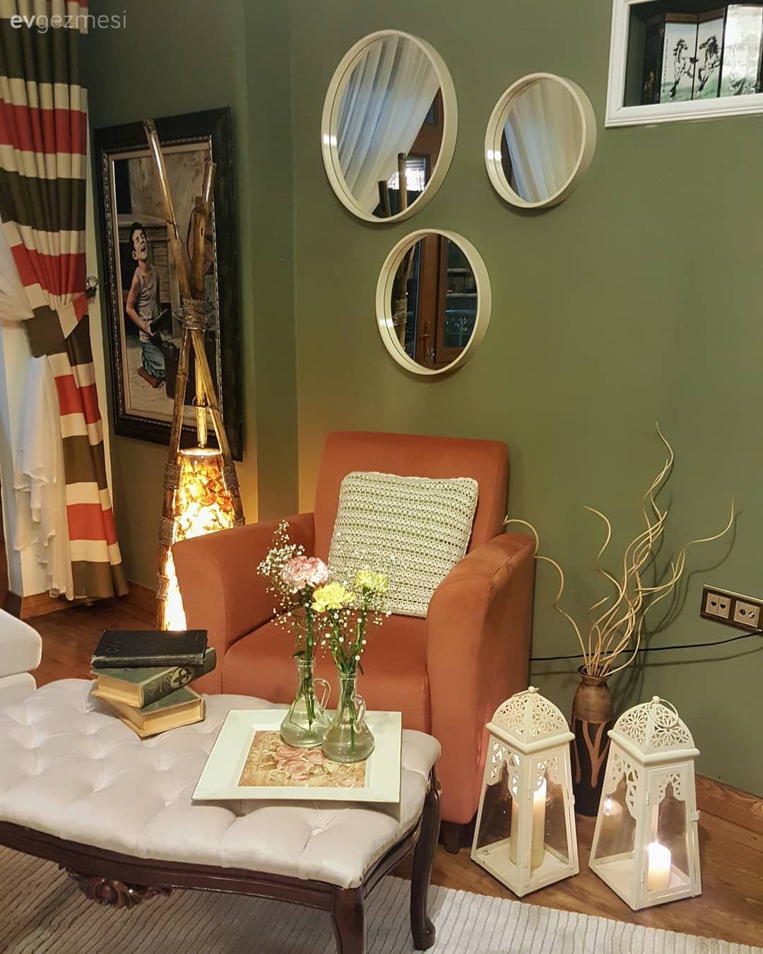Oturma Odası, Yeşil, Turuncu, Krem, Yeşil duvar, Yan sehpa, Sehpa, Berjer, Beyaz, Duvar dekorasyonu, Duvar Nişleri, Duvar saati, Bank, Halı, Kırlent, Koltuk örtüsü, Tablo, Fener, Ev Aksesuar, Fon perde, Perde, Tül perde, Çizgili desen, Desenler, Ayna, Yuvarlak ayna, Dekoratif ayna