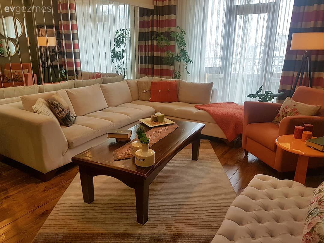 Oturma Odası, Yeşil, Turuncu, Krem, Köşe koltuk, Koltuk takımı, Berjer, Orta sehpa, Salon, Ahşap Mobilya, Uzanma koltuklu köşe, Halı, Fon perde, Perde, Tül perde, Çizgili desen, Desenler, Duvar ayna kaplama, Ayna, Lambader, Aydınlatma, Ev bitkisi, Yan sehpa, Sehpa, Sehpa üstü aksesuarı, Ev Aksesuar, Dubleks evler