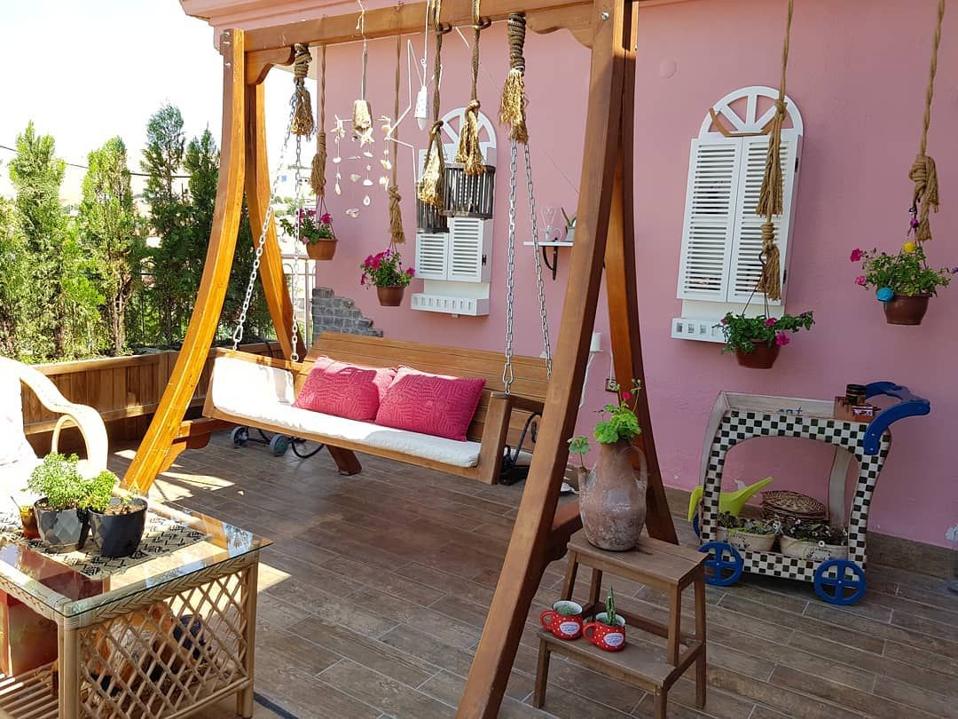 Teras, Pembe, Beyaz, Hasır, Hasır sandalye, Bahçe oturma grubu, Bahçe, Çiçekli desen, Desenler, Salıncak, Balkon duvar dekorasyonu, Pencere duvar dekoru, Balkon çiçekleri, Saksı, Ferforje