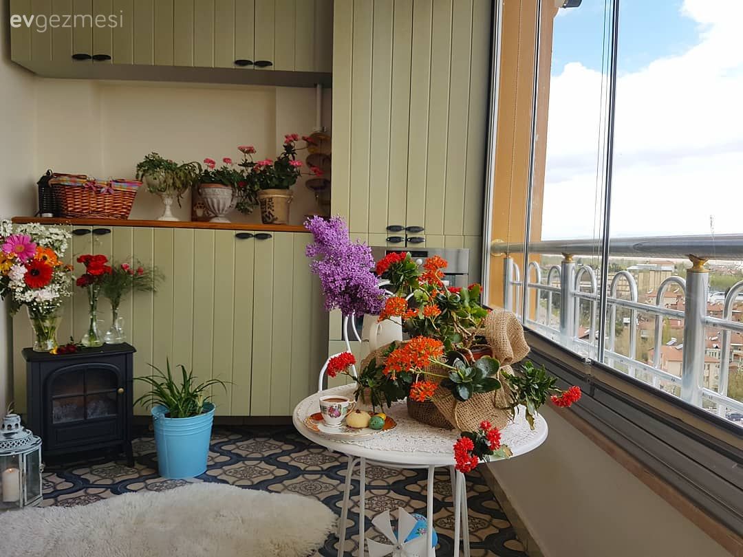 Balkon, Balkon oturma grubu, Sedir, Beyaz, Mavi, Ferforje, Sandalye, Balkon masası, Balkon çiçekleri, Kırlent, Çiçekli desen, Desenler