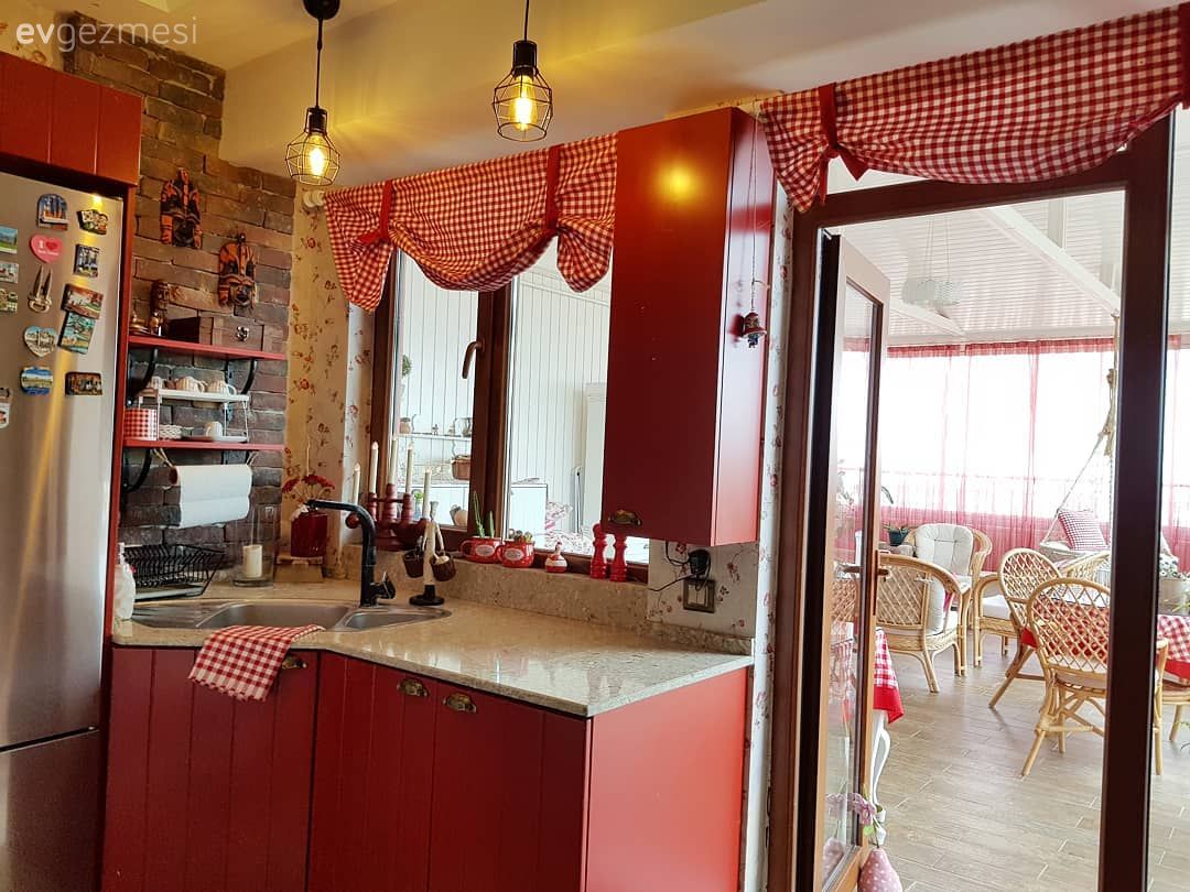 Dubleks evler, Mutfak, Kırmızı mutfak, Mutfak tezgahı, Mutfak tezgah arası, Taş duvar, Duvar dekorasyonu, Mutfak duvar dekorasyonu, Mutfak Avize Modelleri, Mutfak perdesi, Duvar kağıdı, Çiçekli desen, Desenler, Mutfak rafı, Pötikare kumaş, Beyaz