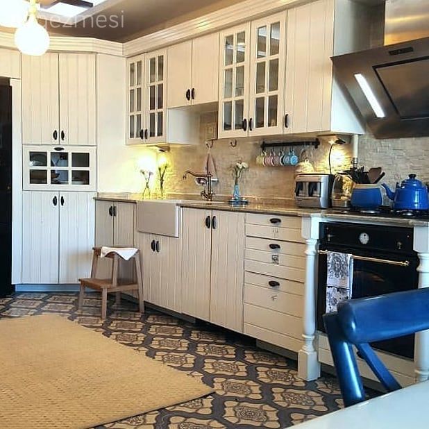 Mutfak, Beyaz mutfak, Mavi, Vintage, Aydınlatma, Mutfak tezgahı, Mutfak tezgah arası, Davlumbaz, Mutfak zemin seramikleri, Mutfak masası, Sandalye, Mutfak Avize Modelleri, Avize, Mutfak halısı, Halı, Mutfak aksesuarları