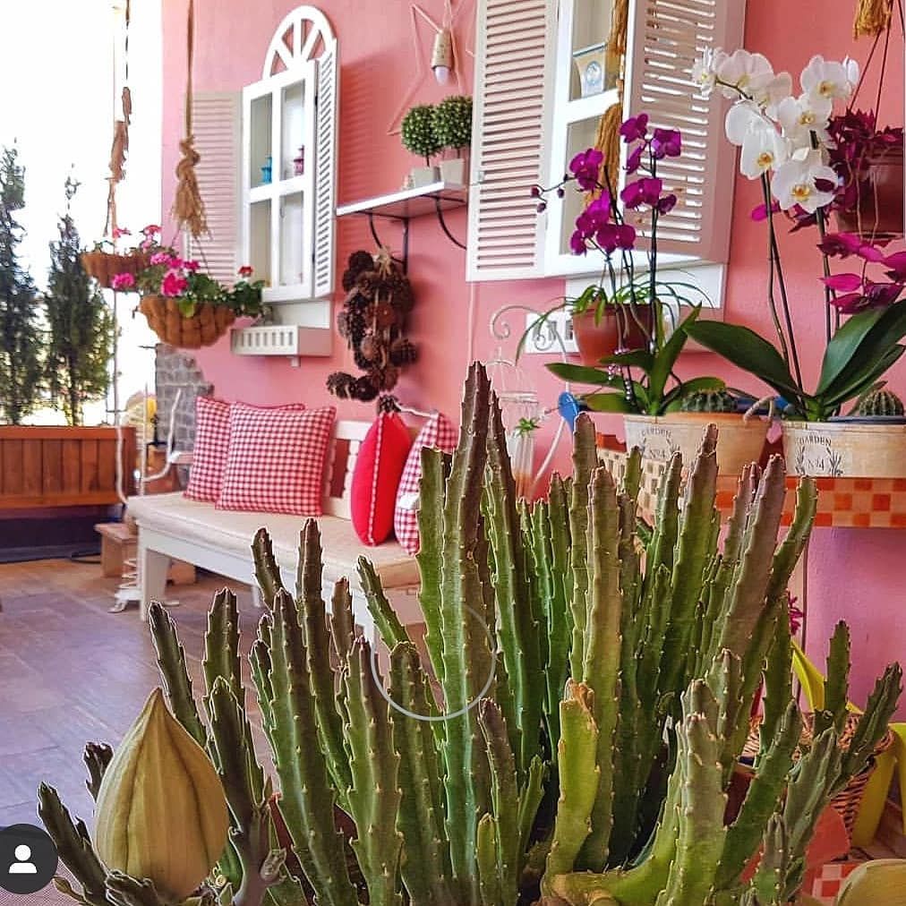 Teras, Pembe, Beyaz, Balkon duvar dekorasyonu, Pencere duvar dekoru, Balkon çiçekleri, Saksı, Ferforje, Orkide, Kaktüs
