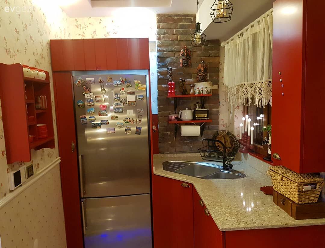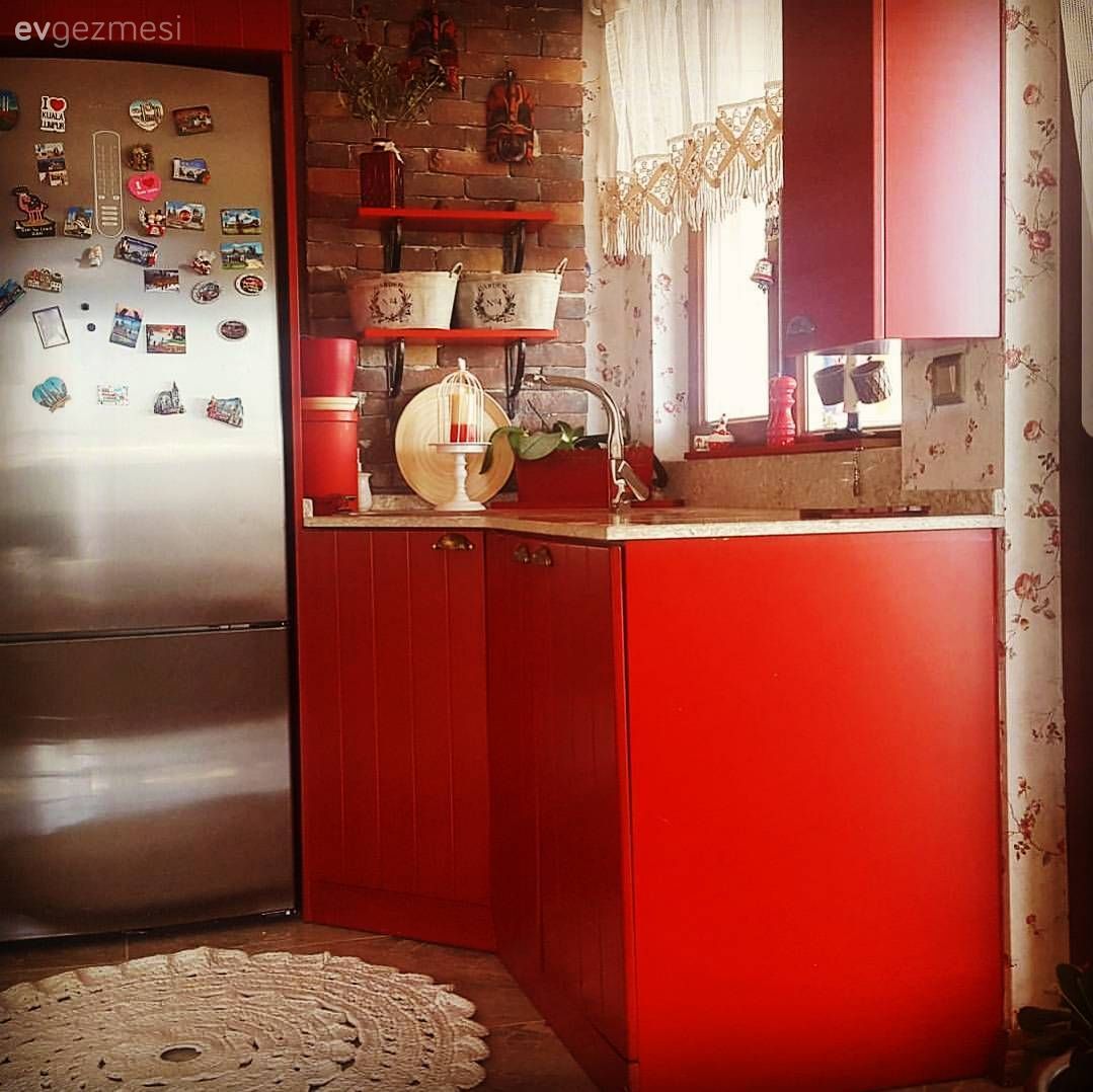 Dubleks evler, Mutfak, Kırmızı mutfak, Mutfak tezgahı, Mutfak tezgah arası, Taş duvar, Duvar dekorasyonu, Mutfak duvar dekorasyonu, Mutfak perdesi, Duvar kağıdı, Çiçekli desen, Desenler, Mutfak rafı, Mutfak halısı, Örgü halı