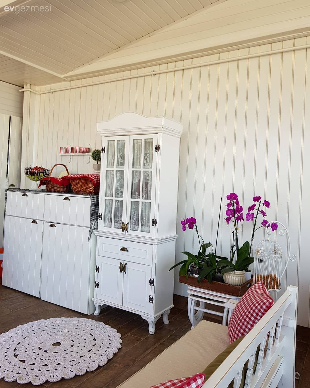 Kış bahçesi, Lambri, Lambri tavan, Dolap, Bahçe oturma grubu, Bahçe, Kırmızı, Beyaz, Orkide, Örgü halı, Kırlent, Pötikare kumaş, Sehpa
