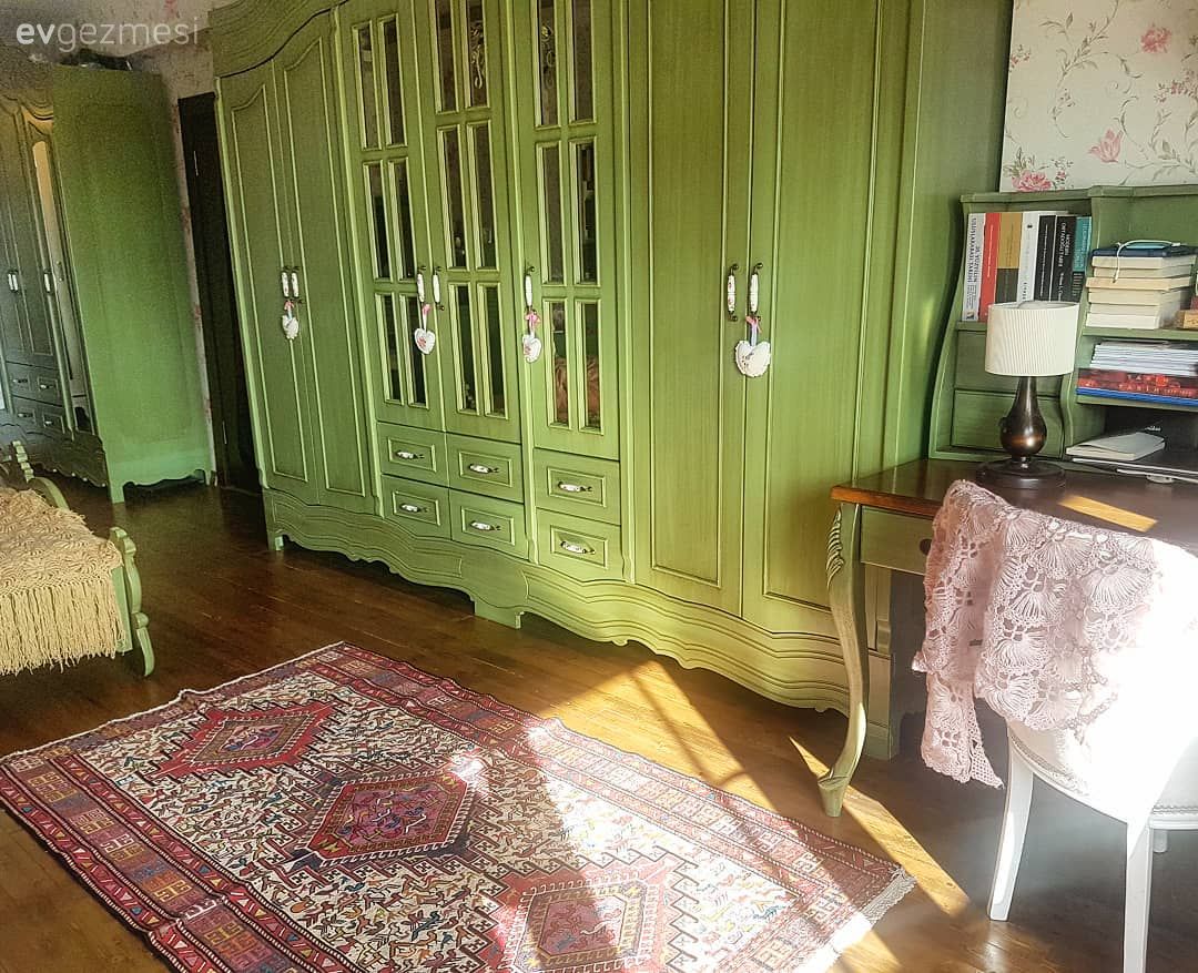 Yatak Odası, Yeşil, Çalışma masası, Sandalye, Yatak odası halısı, El dokuma halı, Gardrop, Duvar kağıdı, Duvar dekorasyonu, Çiçekli desen, Desenler, Krem, Abajur, Aydınlatma