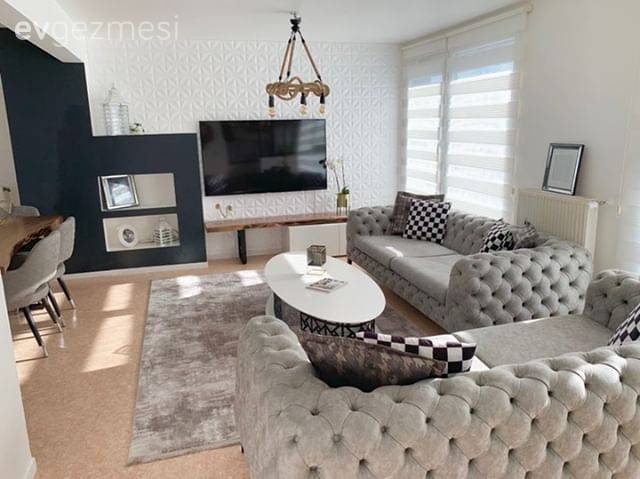 Salon, Beyaz, Gri, Dörtlü koltuk, Çerçeve, Duvar dekorasyonu, Tavana monte salıncak, Salıncak, Fon perde, Perde, Tül perde, Orta sehpa, Sehpa, Yan sehpa, Ev bitkisi, Puf, Berjer, Çiçekli desen, Desenler, Tv ünitesi, Kırlent, Ev tekstili, Makrome, Halı, Salon halısı, Saksı