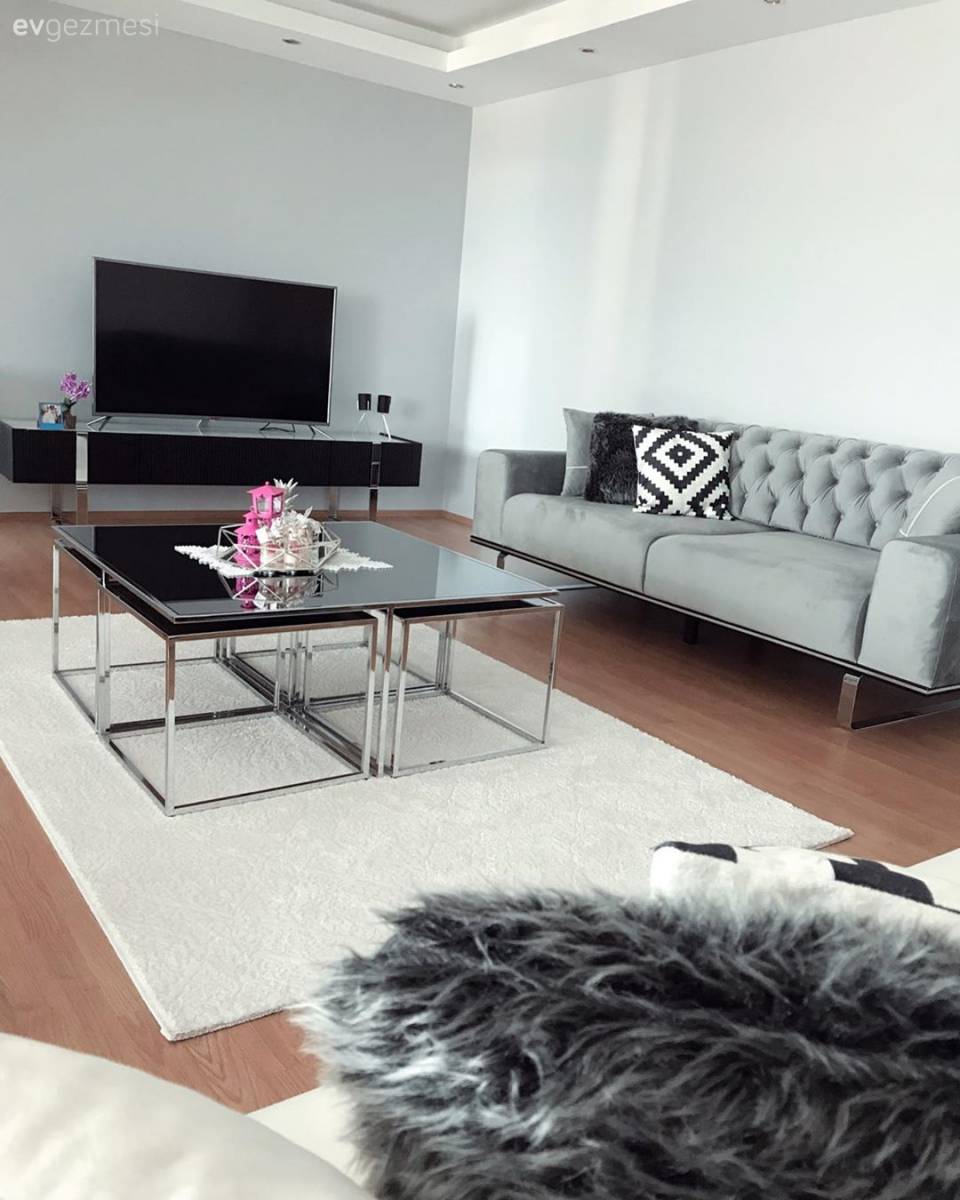 Salonunda keyifli bir ortam yaratmak isteyen Nurşah Hanım, işe ilk olarak renklerden başlamış. Grinin tonlarıyla çevrelediği salonunda araya siyah ve beyazları katarak uyumu yakalamış.