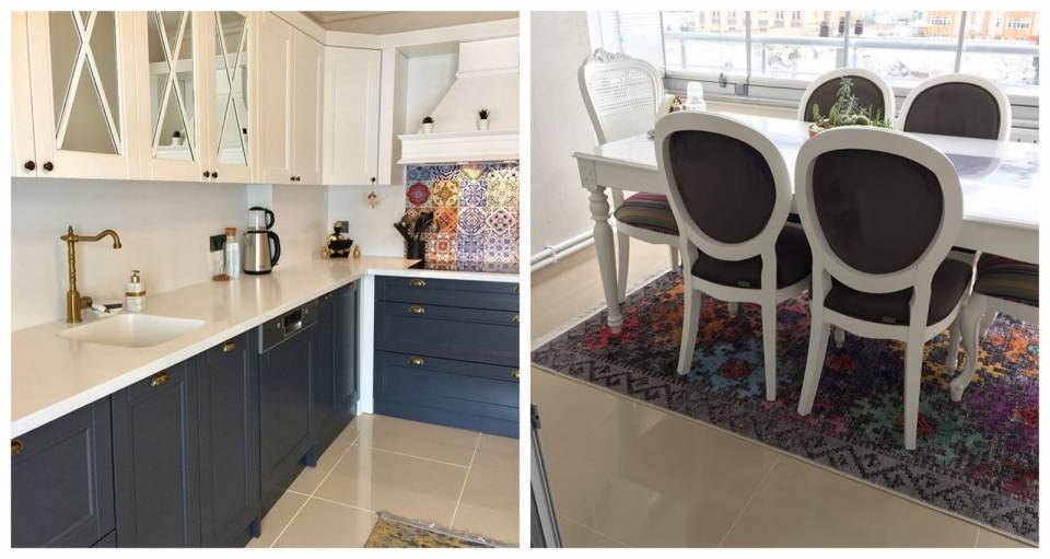 Yemek alanının karşısında duran mutfak, en az burası kadar keyifli. Shaker dolap kapakları ve çini tezgah arasıyla nostaljik sıcaklıktaki bu alan, küçük ama oldukça kullanışlı: Mutfağı yemek alanından ayıran yarım ada, mutfağın hem ekstra kullanım alanı hem de yemek için alternatif bir masa.