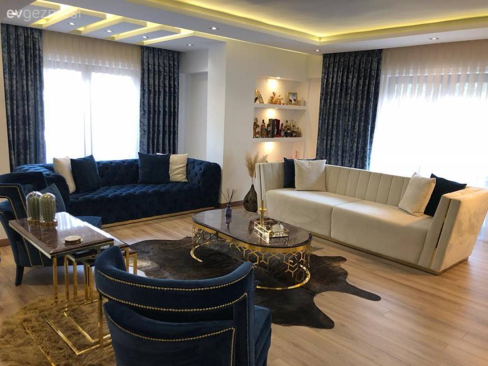 Salon, Country, Country salon, Lacivert, Orta sehpa, Lacivert ve beyaz dekorasyonu, Chesterfield, Beyaz halı
