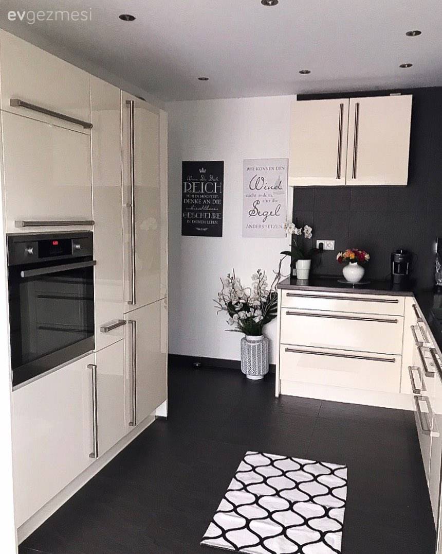 Mutfak, Beyaz mutfak, Mutfak tezgahı, Siyah tezgah, Mutfak tezgah arası, Modern mutfak, Tablo, Duvar dekorasyonu, Davlumbaz, Kulpsuz mutfak dolabı