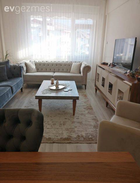Ayşegül Hanım'ın pozitif salonu için seçtiği mobilyalar oldukça konforlu. Ortamın keyifli halini devam ettirecek rahat koltuklar, zeminde herhangi bir tüy barındırmayan halı ve ahşabın sıcaklığını alan tamamlayıcı sehpalar.