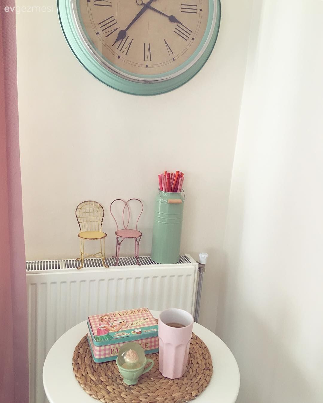 Enerjisiyle mutluluk yayan bir evin konuğuyuz. Evimizde pastel tonlardan pembe, mavi ve yeşilin buluşması var. Bu üç renk buluşur da neşe saçmadan durur mu?