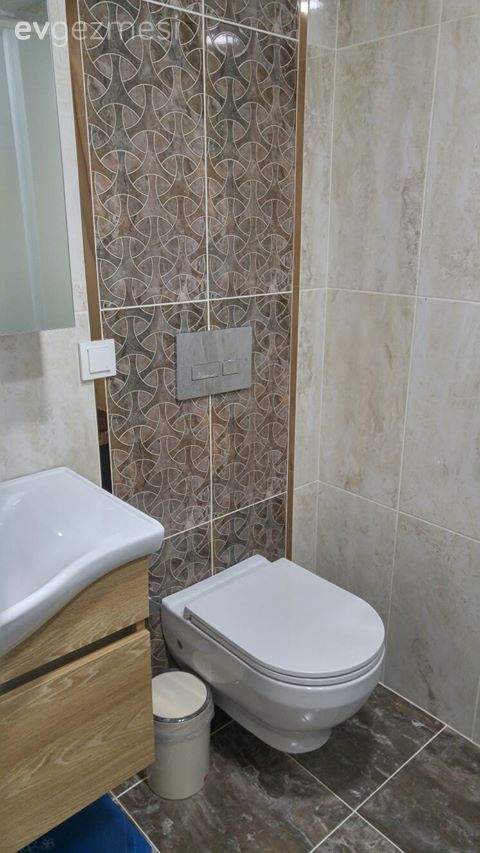 Daha kullanışlı hale gelen banyonun görünümüne de el atılmış tabi: Eski fayanslar yerine mermer görünümlü fayanslar gelmiş. Kahverengi ve beyazın uyumuyla buluşan fayanslar, yeni banyonun ferahlamasını da sağlamış.