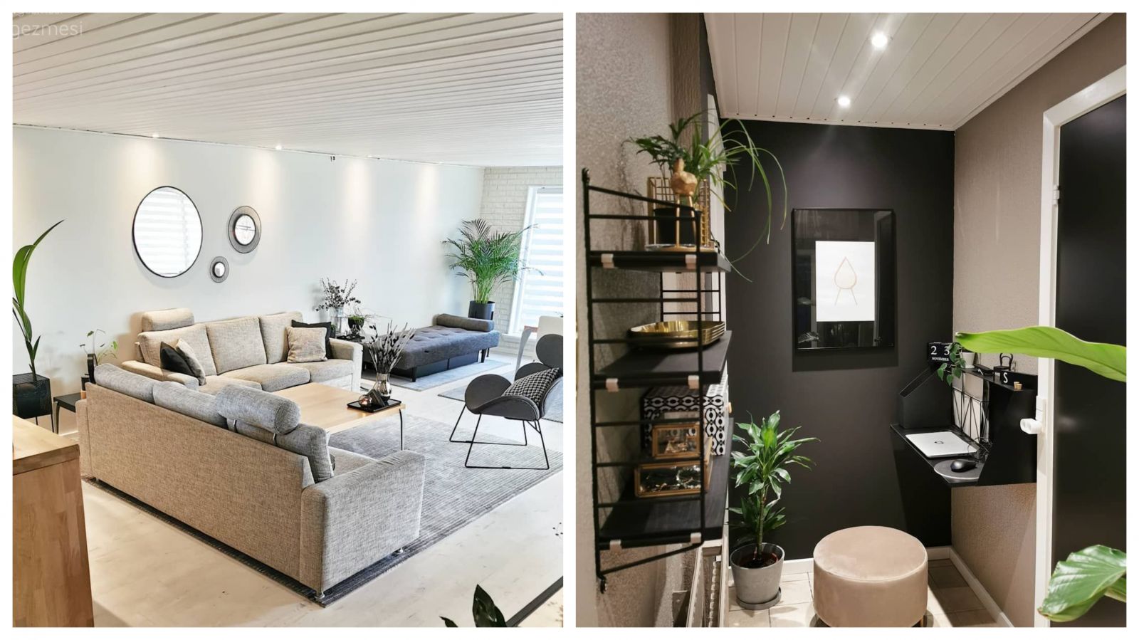 Salon, Büyük salon, Gri duvar, Tavan dekorasyon, Puf, Peluş, Metal duvar aksesuarı, Ev Aksesuar, Çiçeklik, Ev bitkisi, Fener