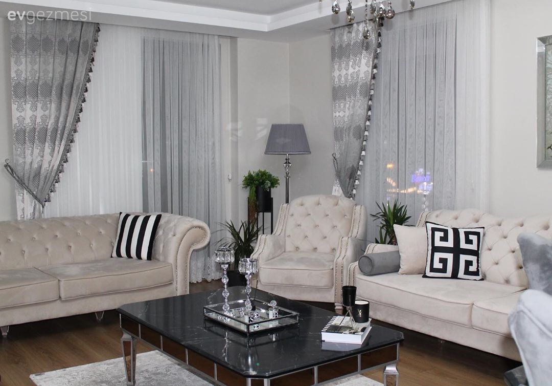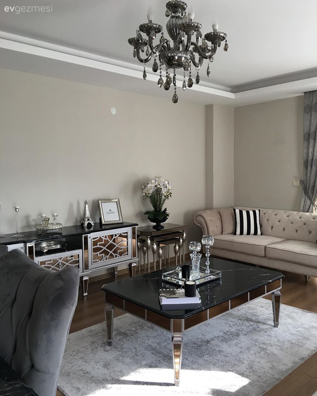 Dekor için seçilen renkler hem uyumlu hem de parlak yüzeylere zemin sağlayacak kadar sakin. Krem ve gri tonları ahenkli baz tonları olmuş, detaylardan beliren gümüşlerde vurguyu sağlamış.
