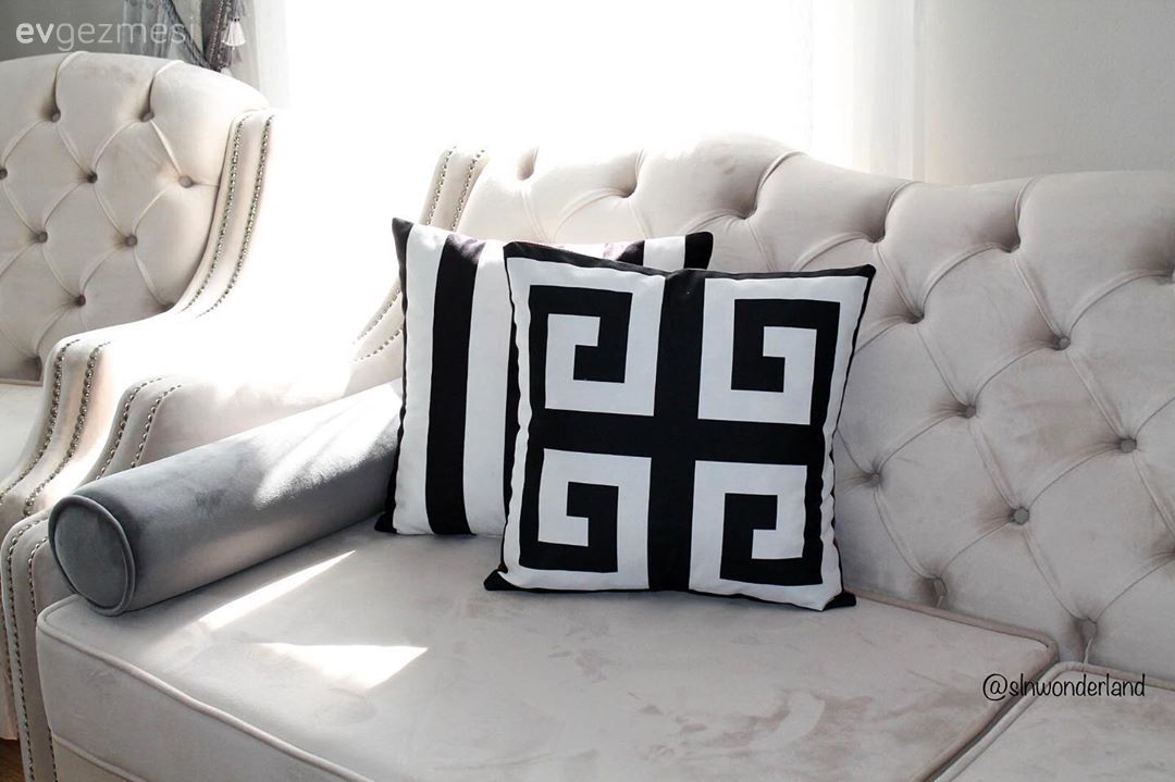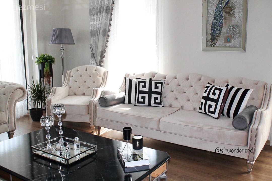 Geometrik formlu koltuklardan biri, konforlu chesterfield ile buluşturulmuş. Formlarda kendini gösteren geometrik esintiler kırlent kılıflarındaki desenlerle de devam ettirilmiş.