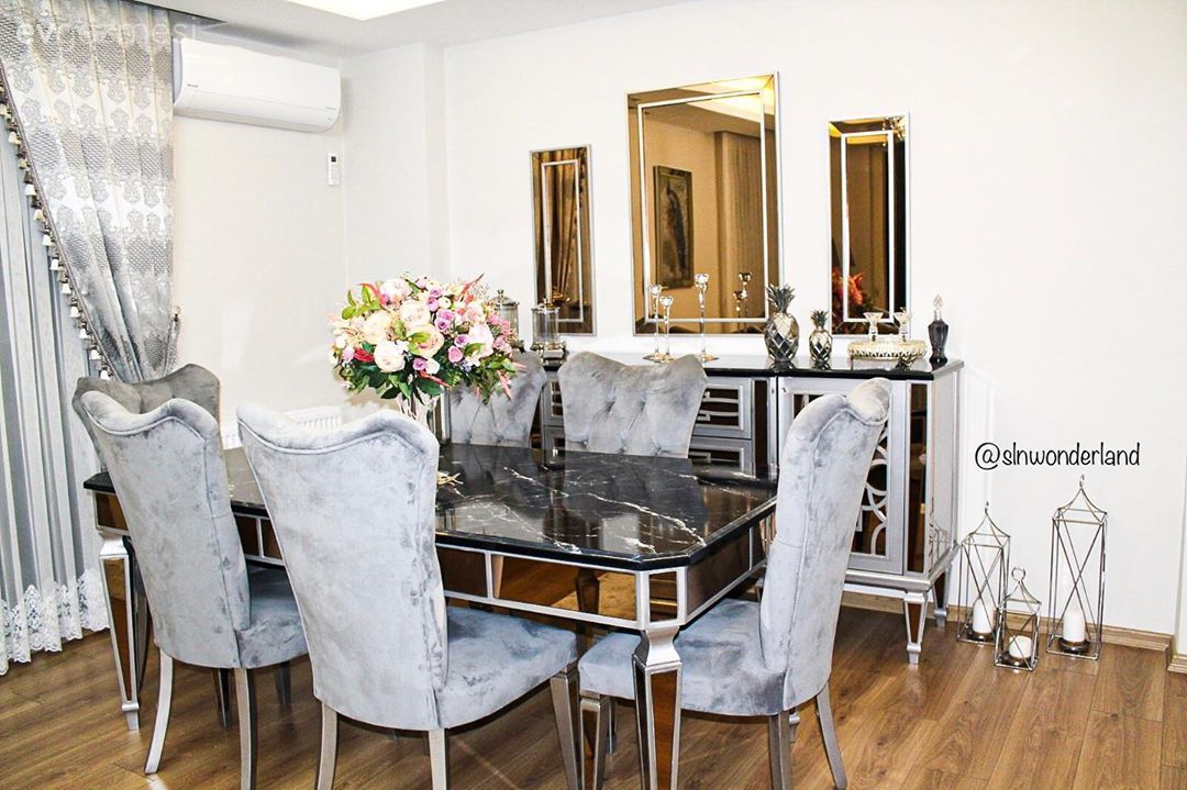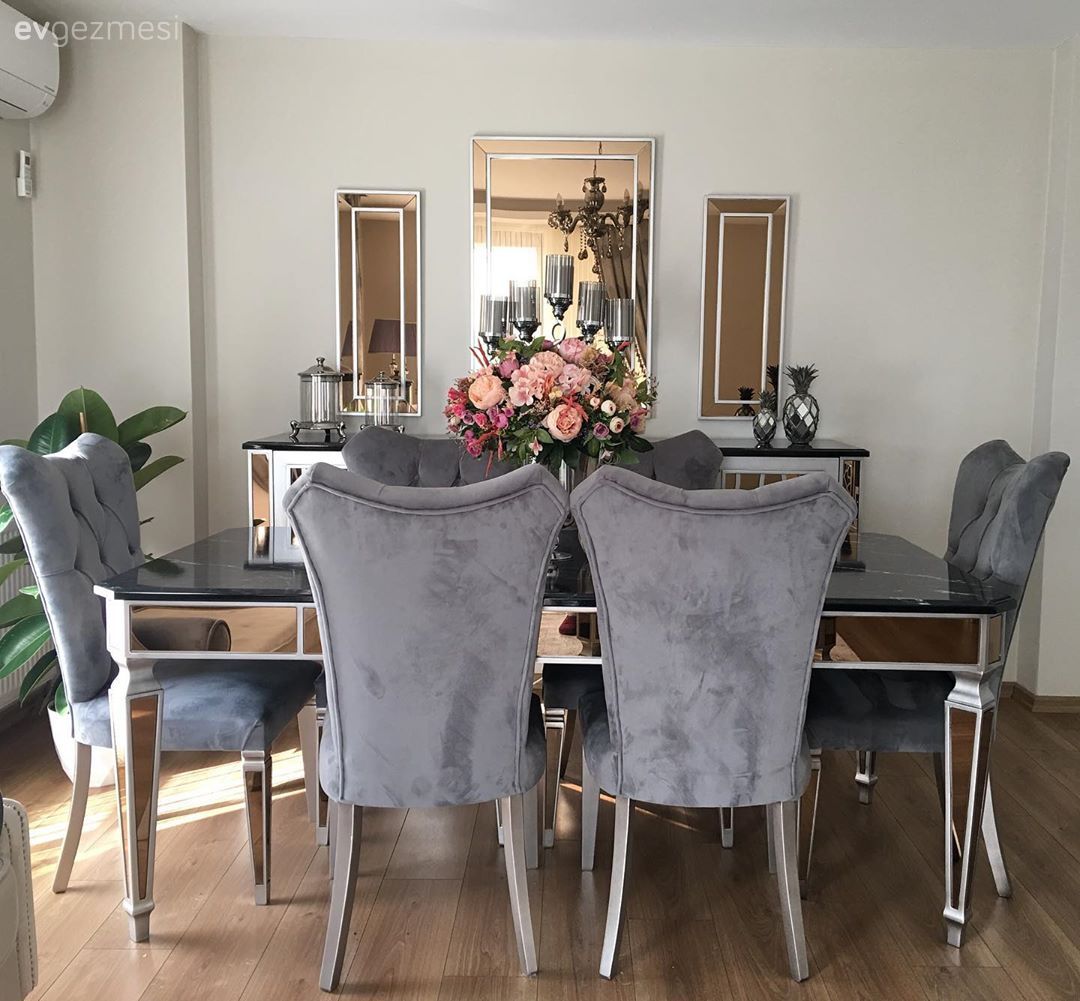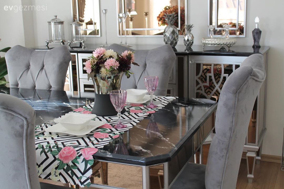 Yemek masasında tercih edilen mermer görünümünün yarattığı kalite algısını da unutmamak gerekir. Yine ayna detaylarla tamamlanan bu masa, bu şekilde lüksü de kaliteyi de dekora katmış.