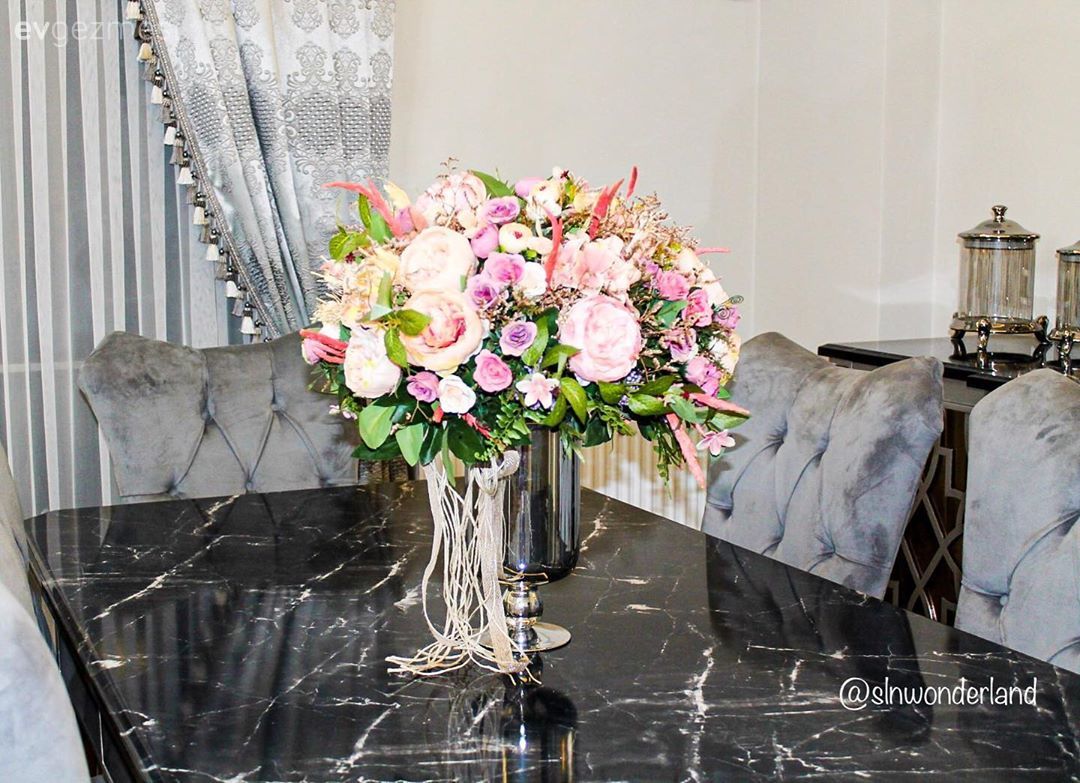 Dekorun son dokunuşları için aksesuarların ne denli önemli olduğunu bilen Selen Hanım, şamdanları ve kristal objeleri eksik etmemiş. Kullandığı aksesuarların tavandan sarkan şık avizeyle uyumu da, dikkat çekilecek ayrı bir nokta!