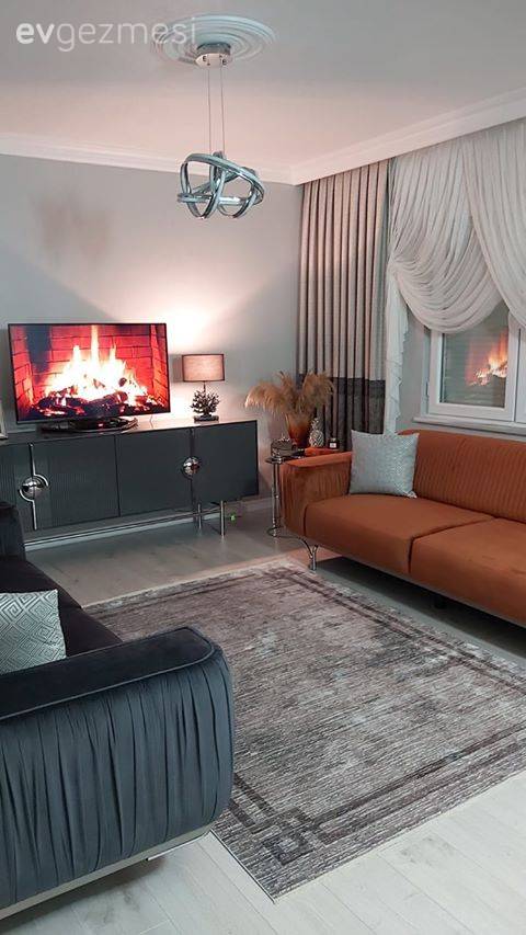 Dubleks evler, Salon, Büyük salon, Modern, Halı, Salon halısı, Krem, Berjer, Cam orta sehpa, Orta sehpa, El dokuma halı, Tv ünitesi, Beyaz, Gri, Tül perde, Perde, Avize, Aydınlatma, Salon avizesi, Ev bitkisi