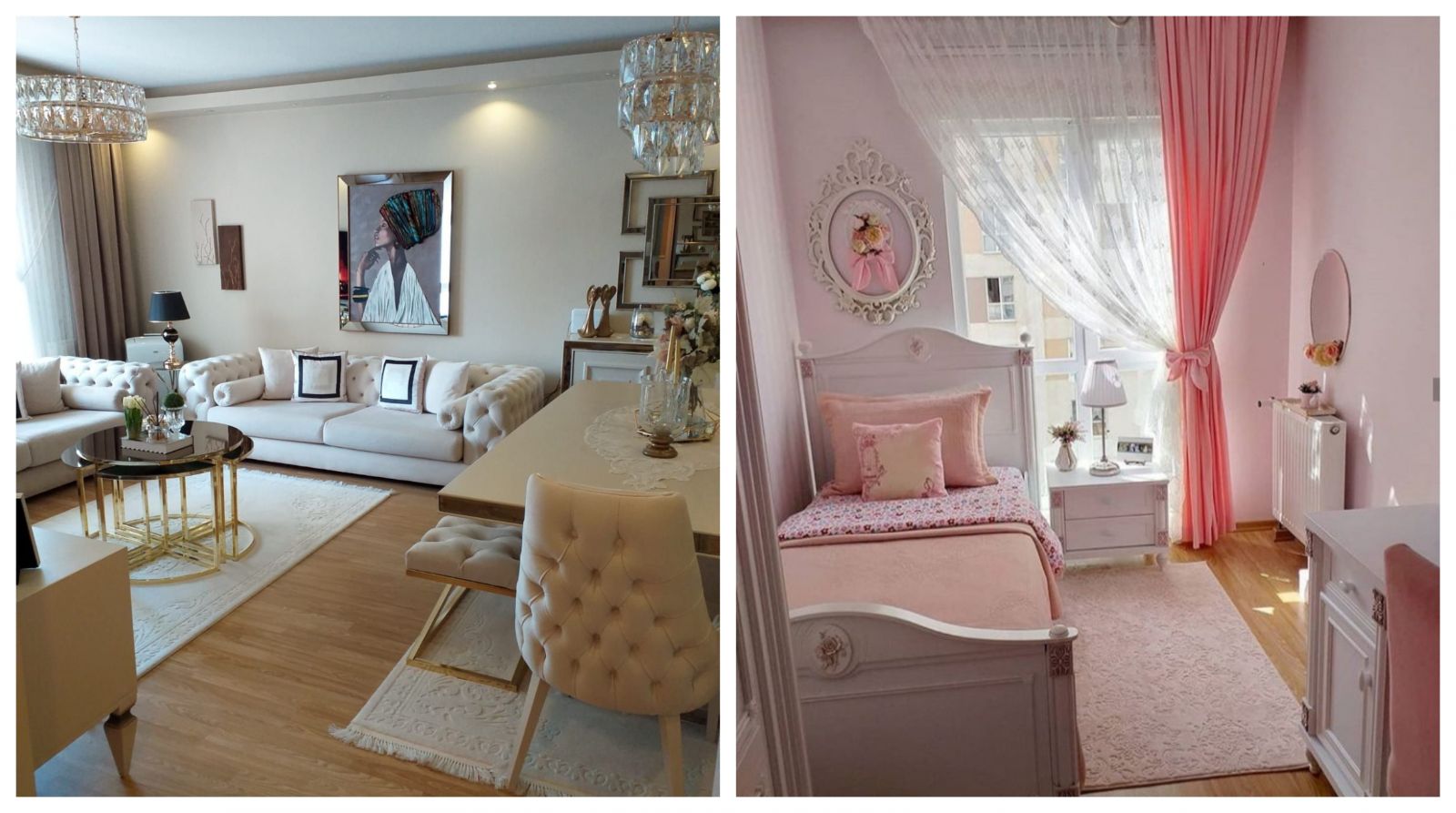 Açık renkler ve aynalar bir yerdeyse o ortamdan en çok ferahlık beklenir. Nitekim konuk dekorumuz da öyle! Hem açık renkler hem de aynalarla ferahlayan alan, bir de kristal detaylı iki büyük avizeyle aydınlatılmış. Ee aydınlık olmasın da ne olsun?