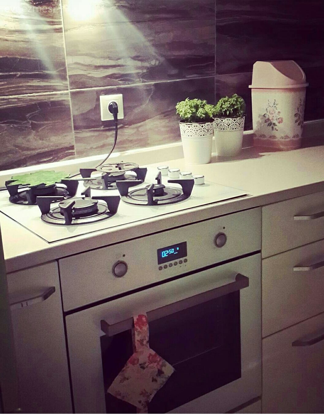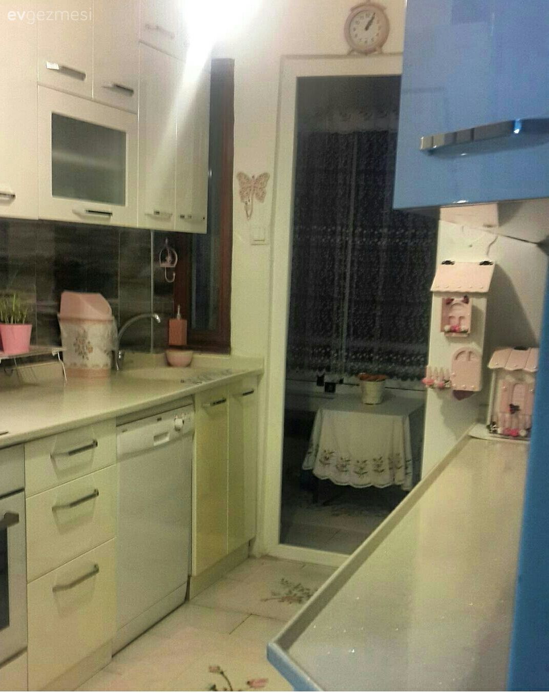 Evim 84 m2 toki 25 yillik bir ev, evi aldıktan sonra parkesinden duvar rengine banyo mutfak her yeri değiştirip tadilat yaptık. Mutfak özel yapim aslında çok küçük olmasına rağmen çizimini kendim yaparak bol dolapli ve çift tezgahli tasarlayarak mutfağı daha kullanışlı bir alan haline getirdik. Mutfakta masa kullanmadık. Çünkü evi aldigimizda 3 kisilik,birkac sene sonra 4 kisilik bir aile olduk. Ve zaten ne üç kişi ne de dört kişi mutfakta masada yemek yiyemezdi çok dardi o nedenle hep salondaki yemek masamizi kullandik.