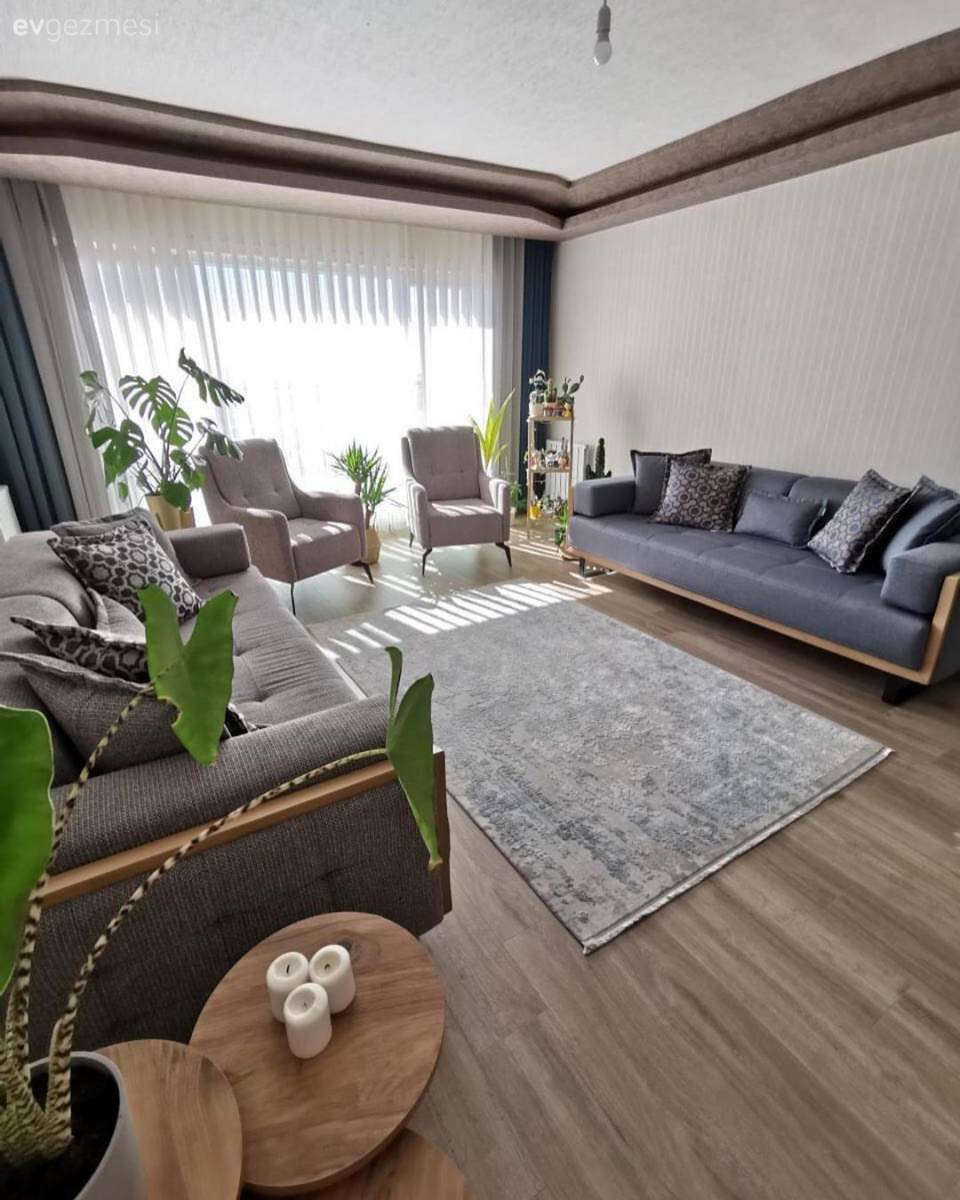 Grinin koyu tonundan seçilen kanepeleri, yumuşatmak için doğal ahşabı seçen ev sahibimiz, tamamlayıcı her mobilyada bu seçimini öne çıkarmış.