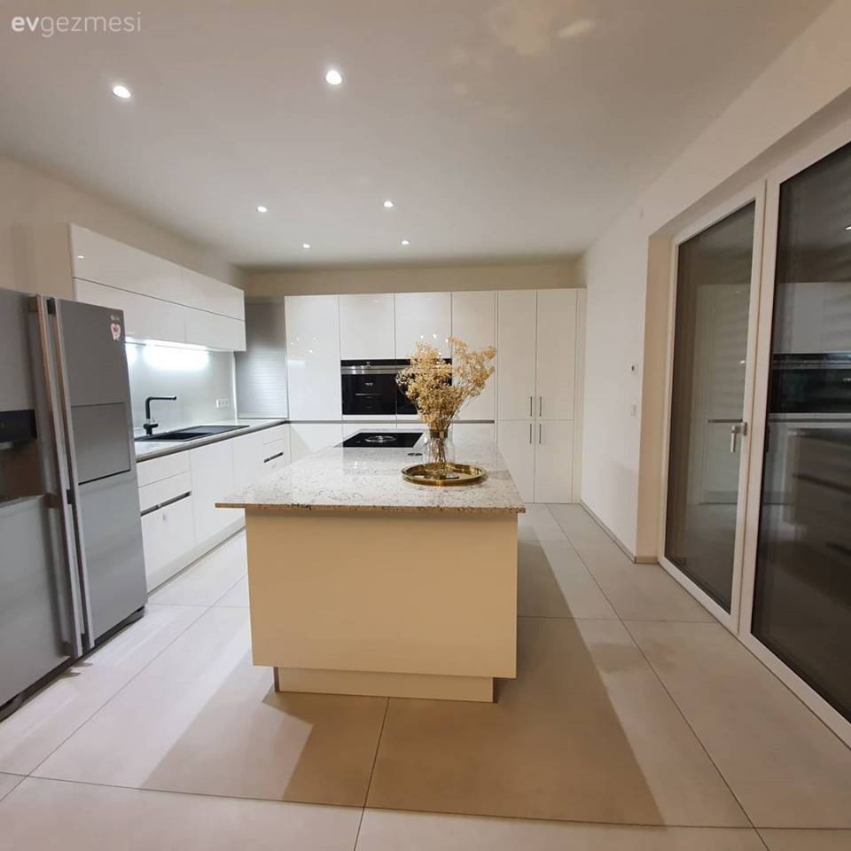 Beyazın olduğu bir yerde metalik yansımaların ne kadar şık durduğunu bilen Duygu Hanım, mobilya detaylarında yer alan pirinçlerle cazibeli dokunuşlar sağlamış.