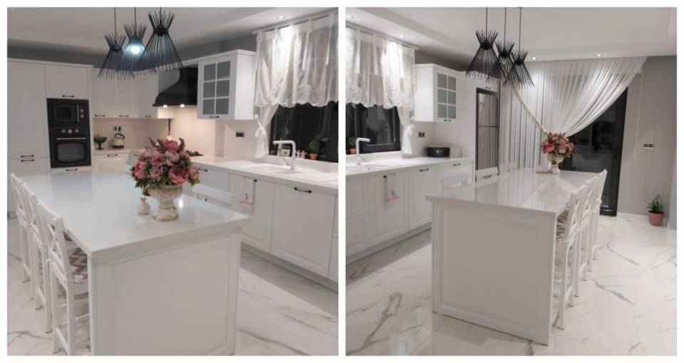 "Bembeyaz bir mutfak nasıl abartı durmadan ışıldar" diye düşünmüş ev sahibimiz, Sonrasında da imdadına masa üstüne seçtiği oval ayna ve tezgah arası detayları yetişmiş.